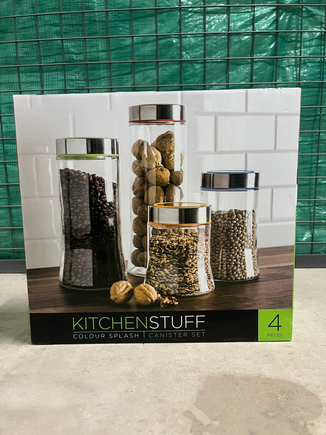 55Keep your kitchen organized in style with this 4-piece canister set. Each jar features a colorful accent lid and is perfect for storing coffee beans, grains, nuts, and more. Pick Up Only: 2335 Sheppard Ave West Payment: Cash Only Contact: Message if interested – serious inquiries only please.