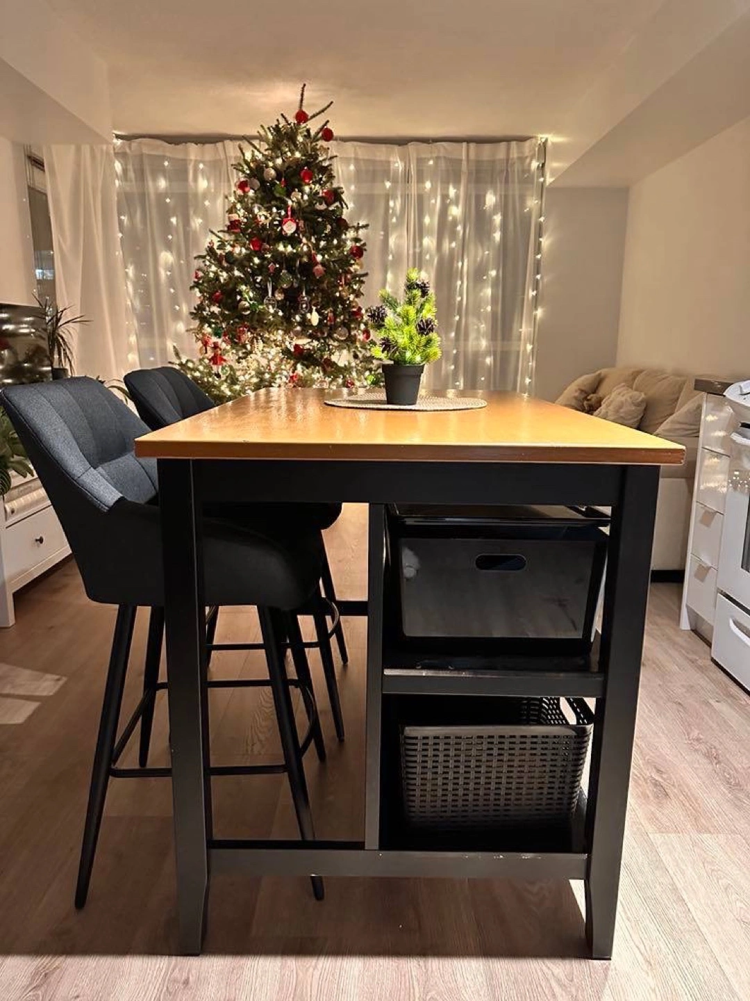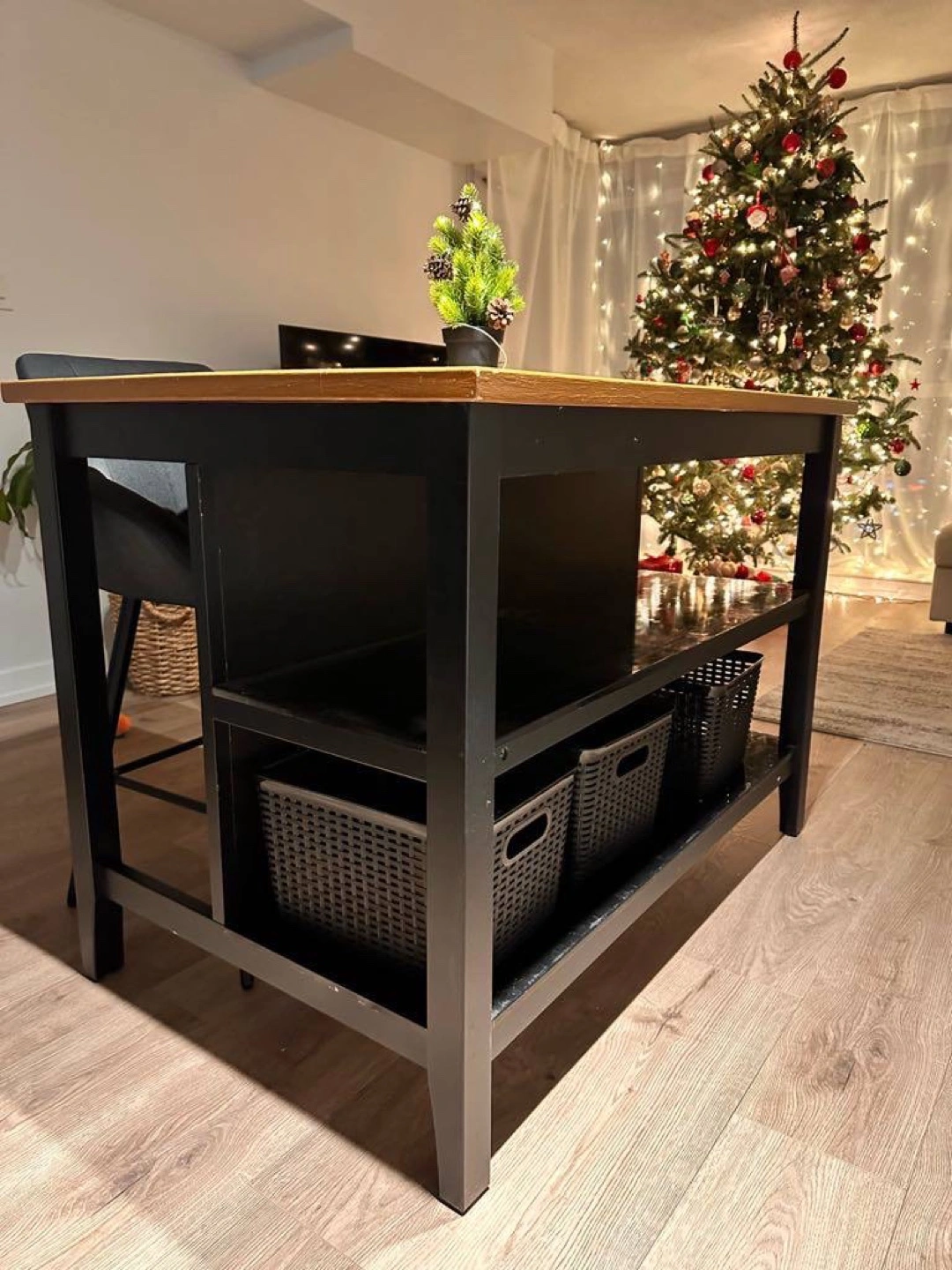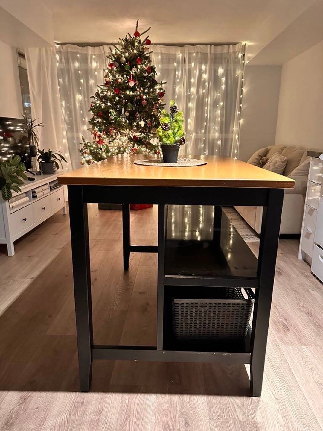 14Dimensions: Height 90 cm, Width 80 cm, Length 127 cm Condition: Refreshed and painted, used for 4 months. Description: Versatile piece that works perfectly as a kitchen island or table. Sturdy and stylish, ideal for any kitchen space.