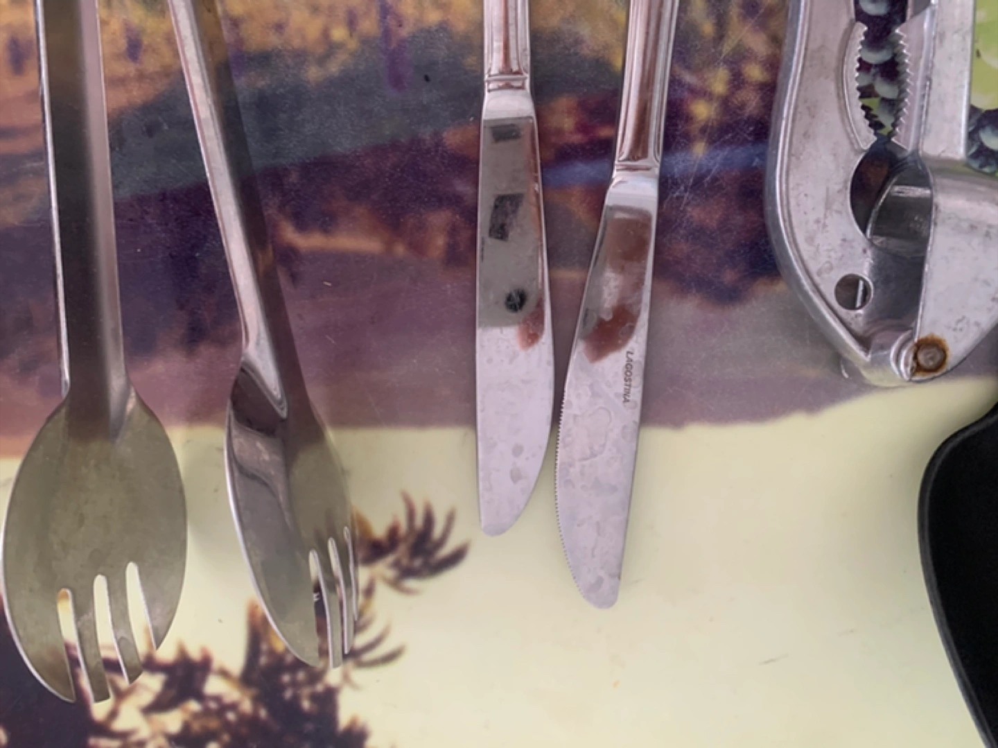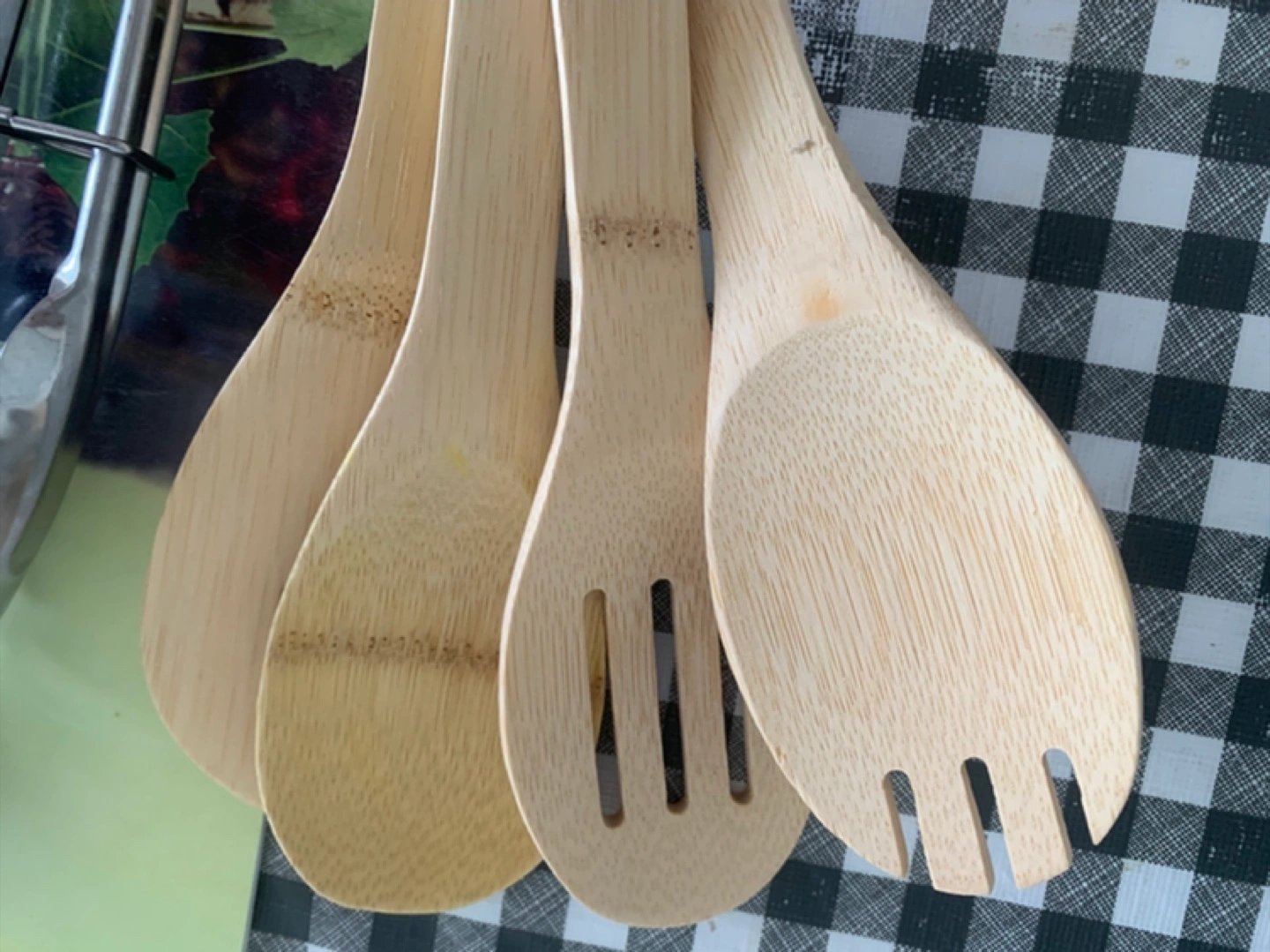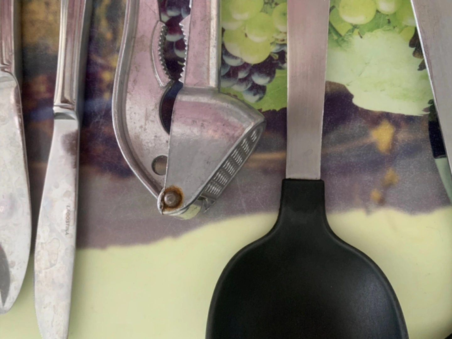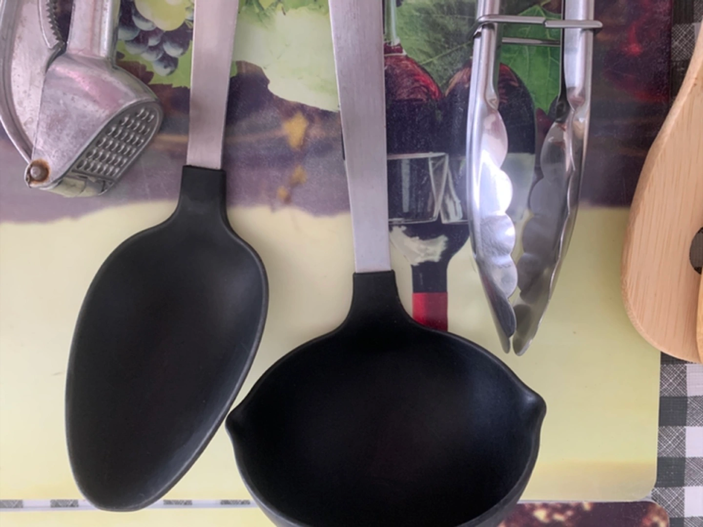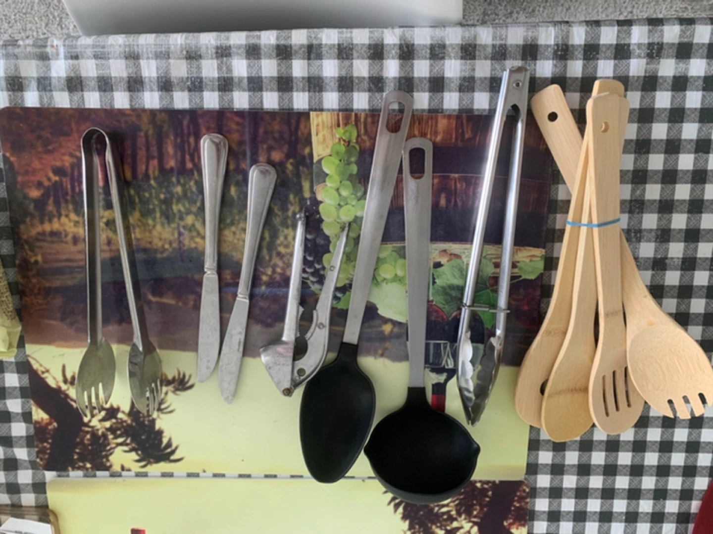 144Selling a set of kitchen utensils, including a garlic press, tongs, knives (Lagostina), and wooden spoons