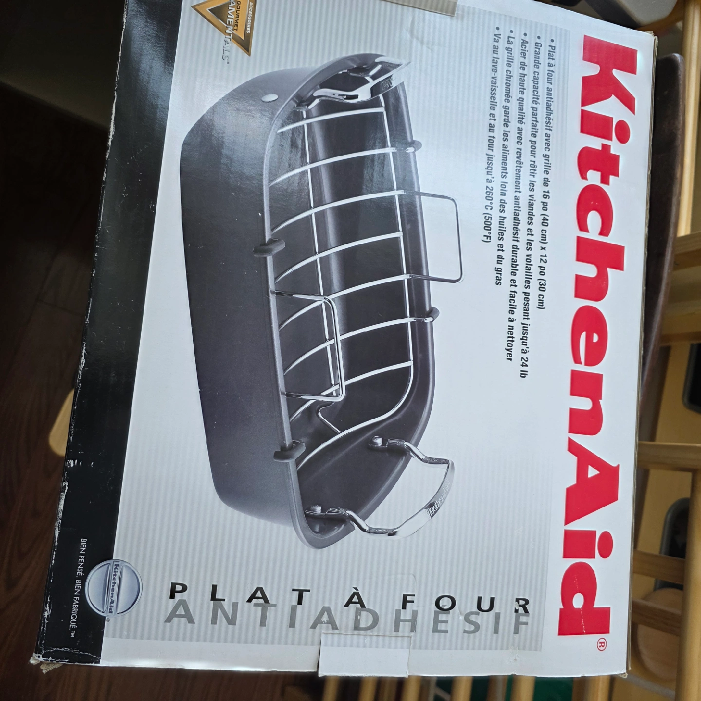Selling a KitchenAid antiadhésif roasting pan with rack. It's perfect for roasting meats and poultry up to 24 lbs! The pan is 16 in (40 cm) x 12 in (30 cm) and is made of high-quality steel with a durable, easy-to-clean non-stick coating. The chrome-plated rack keeps food away from oils and grease. It's also dishwasher and oven safe up to 260°C (500°F)