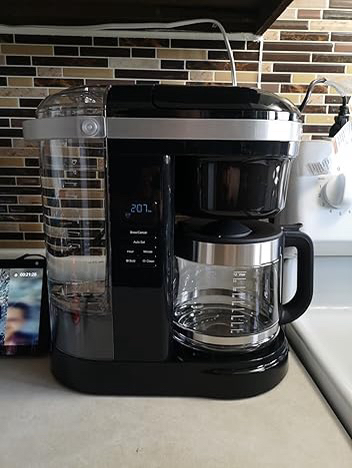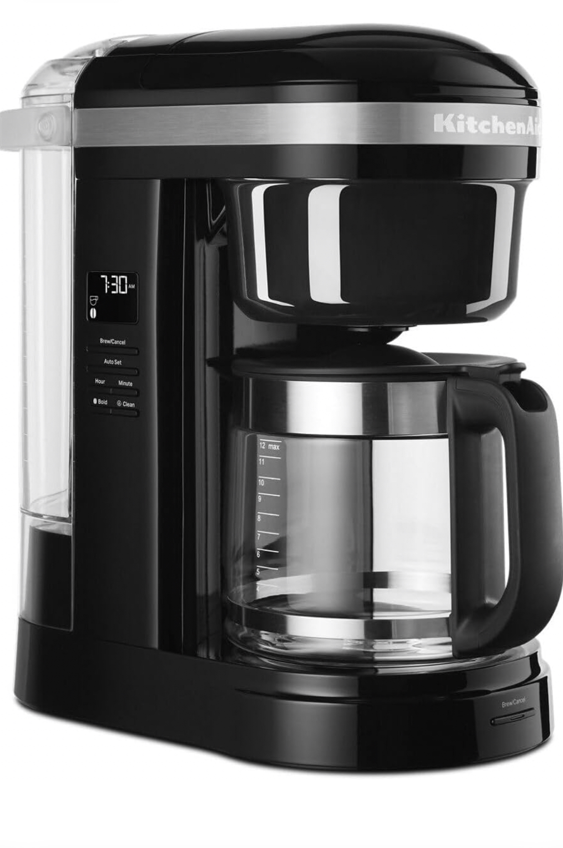 50Unique 29-hole Spiral Showerhead for Great Flavor. Evenly saturates coffee grounds for optimal extraction, producing an exceptionally flavorful cup of coffee. Convenient Measurement Marks for Consistent Results. The water tank's dosage chart and gold tone filter measuring marks ensure consistent results evert time. Clear, Removable Water Tank Makes Filling Easy. The removable water tank is clear with a large opening, minimizing spills and making filling a breeze. Warming Plate Holds Perfect Temperature. The convenient warming plate keeps your coffee at the perfect temperature for up to two hours. Two Brew Buttons to Start Brewing from Any Angle. A brew button on the side and front allows you to place the brewer any direction you want on your countertop, and still start your brew with ease. Unique Spout Design for Easy Pouring. Pour your coffee into cups of any size and shape, hassle-free, with the unique pour spout designed to prevent drips and messes. Model KCM1208 Includes (1) Drip coffee maker, (1) Gold-tone filter, (1) Removable water tank with lid, (1) Glass carafe, (1) Brew basket