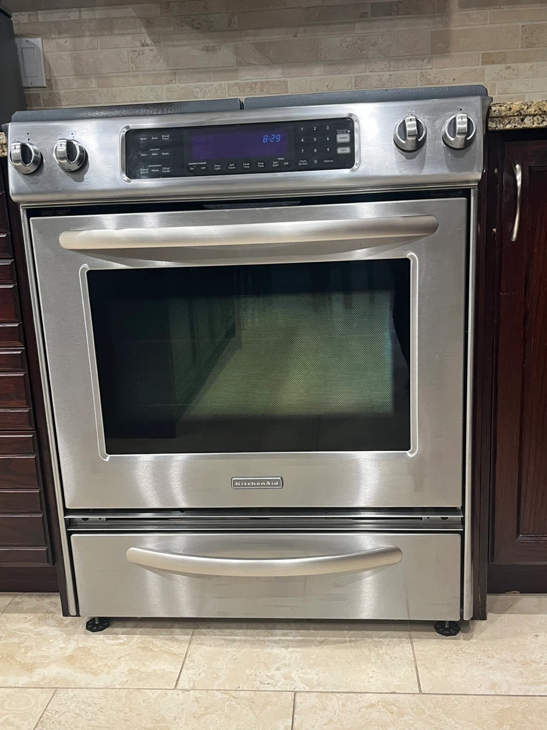 10Selling KitchenAid Convection Gas stove with a stainless steel finish. Stove features four gas burners and gas oven. Great condition 600 obo Features: - Four gas burners - Gas oven convection - Stainless steel finish - Warming drawer Width: 30 inches Height: 35 5/8 inches Depth: 27 1/4 inches Slide-in design: Fits into standard kitchen cabinets for a built-in look. Kitchenaid over the range microwave fan available 150$ Kitchenaid gas stove / range