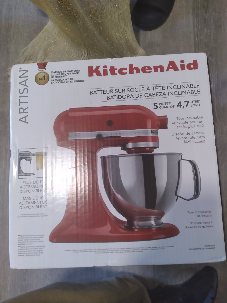 5-Brand KitchenAid -Color Candy Apple Red -Product Dimensions 8.75"D x 14.13"W x 13.94"H -Material Metal -Number of Speeds 10 -Special Feature Removable bowl Description -The KitchenAid Artisan Design Series Stand Mixer adds radiance to any kitchen with a premium metallic finish and elegant 5-Quart glass mixing bowl. -With 10 speeds, easily make your favorite recipes. -Make your culinary efforts even more brilliant with a countertop appliance that mixes, kneads and whips ingredients together with ease. -For even more versatility, the power hub fits optional attachments from food grinders to pasta makers and more. 5 Quart Glass Bowl with handle and measurement markings to mix up 9 dozen cookies* in a single batch. -Dishwasher-safe. *Using the flat beater; 28g dough each Easily add ingredients with the tilt-head design, because you'll have better access to the bowl. Lock the head in place while mixing. -Easily add ingredients with the tilt-head design, because you'll have better access to the bowl - lock the head in place while mixing Match your style with over 20 colors available. -Choose from a full palette of color options to best match your style and personality. -Elevated Design with Metallic Finish and Glass Bowl. This stand mixer's premium metallic finish and elegant glass bowl with easy-to-read measurement markings add a pop of style to your kitchen. -Model KSM155GB includes (1) 5 Quart Glass Bowl with handle, (1) Coated Flat Beater, (1) Coated Dough Hook, (1) 6-Wire Whip See-through glass mixing bowl; the 5 quart glass bowl lets you see your recipe as it mixes for the ultimate in control. -Tilt Head Feature - Easily access the bowl, beaters and ingredients with a simple tilt of the mixer head Exceptional Planetary Action - The beater spirals within the bowl for efficient, thorough mixing, providing beater-to-bowl coverage Metal Construction - Rugged, durable, metal construction ensures years of reliable mixing; helps reduce mixer walk on your counter as well Powers over 12 Optional Accessories - Turn your KitchenAid Stand Mixer into a culinary center with KitchenAid Stand Mixer Accessories. - I want $250.00 for it. - For more information please message me, In case you have any more questions, comments, or concerns. Message me. - Thank you very much, and have a wonderful day π