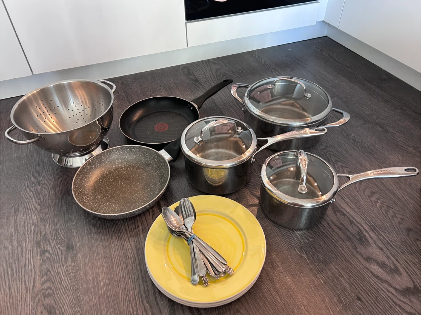 Selling a collection of kitchen essentials! Includes KitchenAid pots and pans with lids, a colander, a frying pan, silverware and a yellow plate