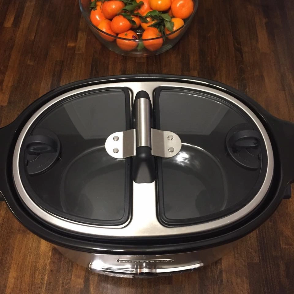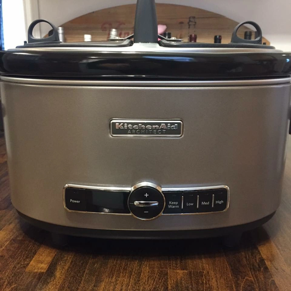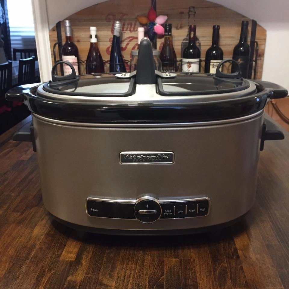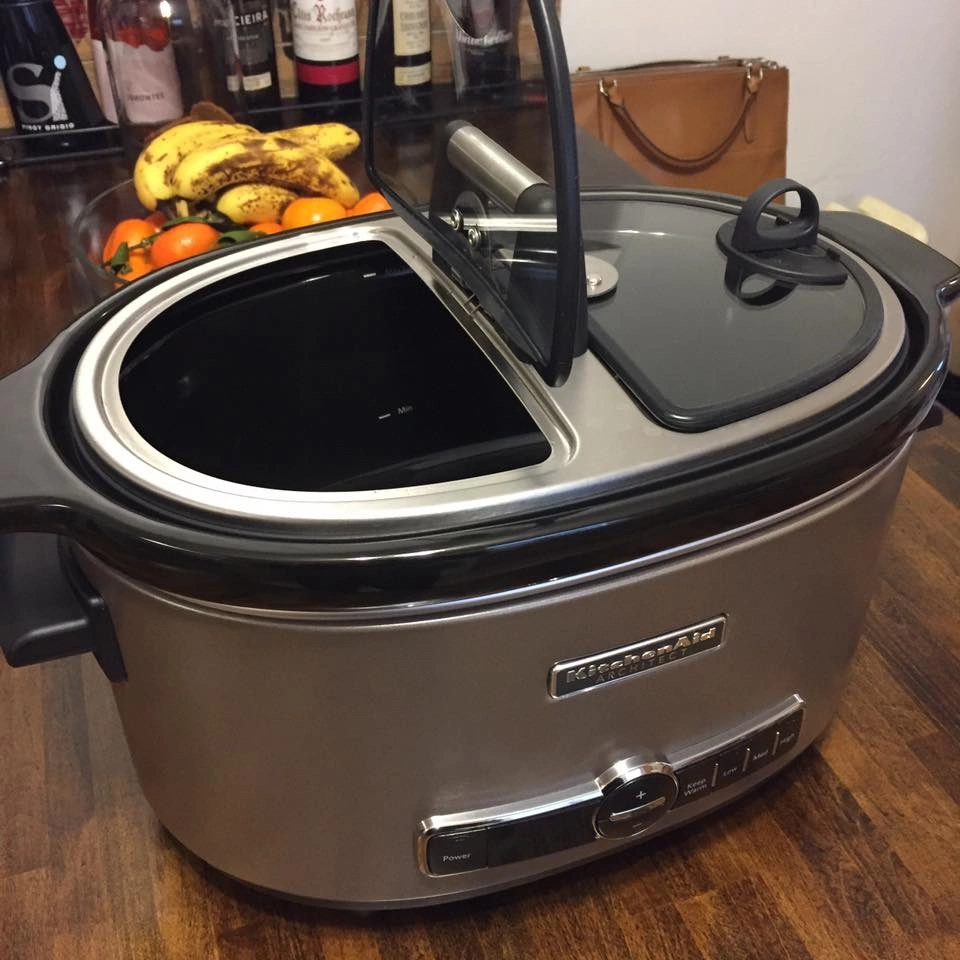 27A KitchenAid brand slow cooker, featuring a removable stoneware insert and a glass lid with two separate serving compartments. 6 quart (5.7L)