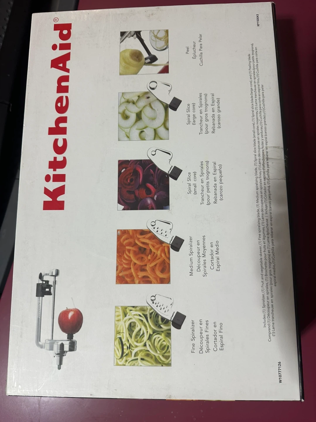 28Selling a brand new KitchenAid Spiralizer with Peel, Core and Slice attachment. It's still in its original box and ready to help you reinvent classic dishes with fresh fruits and vegetables! Includes various blades for different spiral sizes.