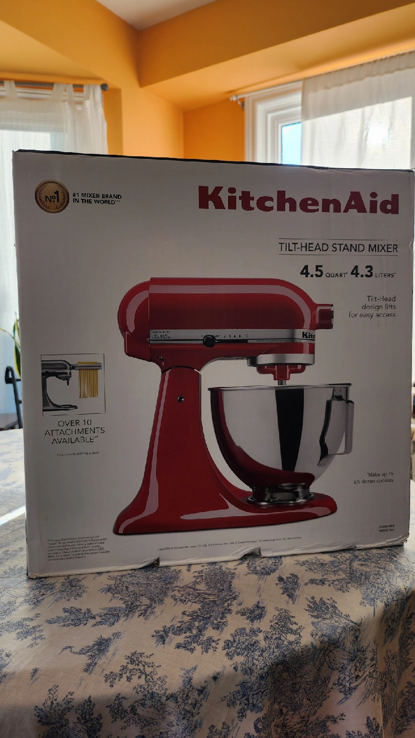 43Selling a KitchenAid Tilt-Head Stand Mixer in red! It's a 4.5 quart mixer and comes with the box. Retails for $499.99. still in box, never opened, never used.