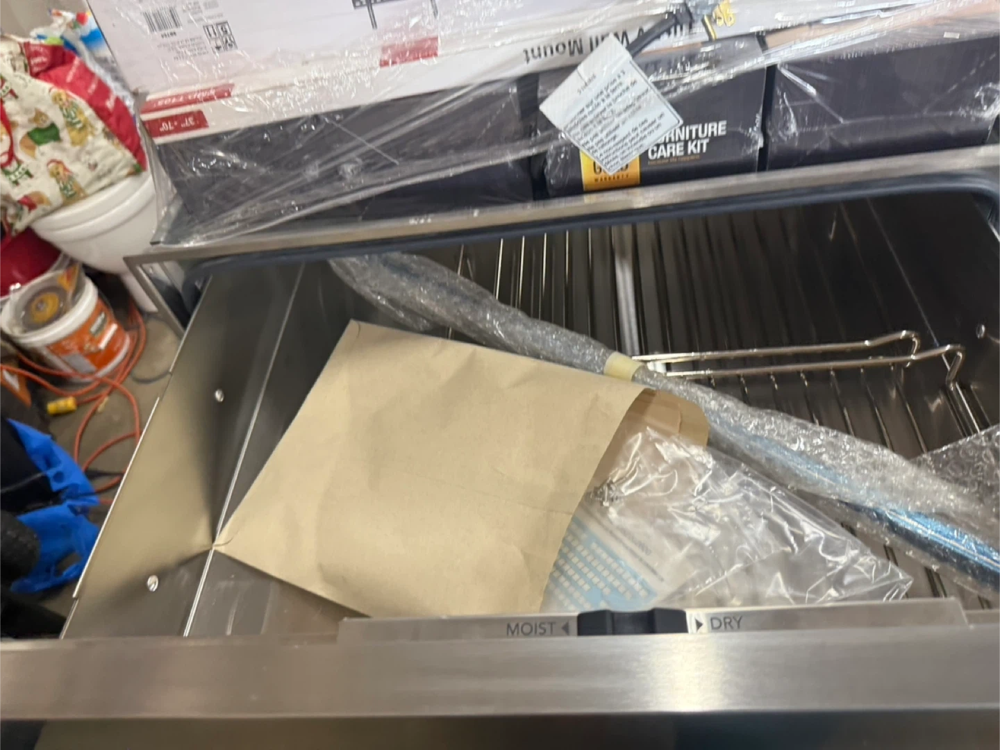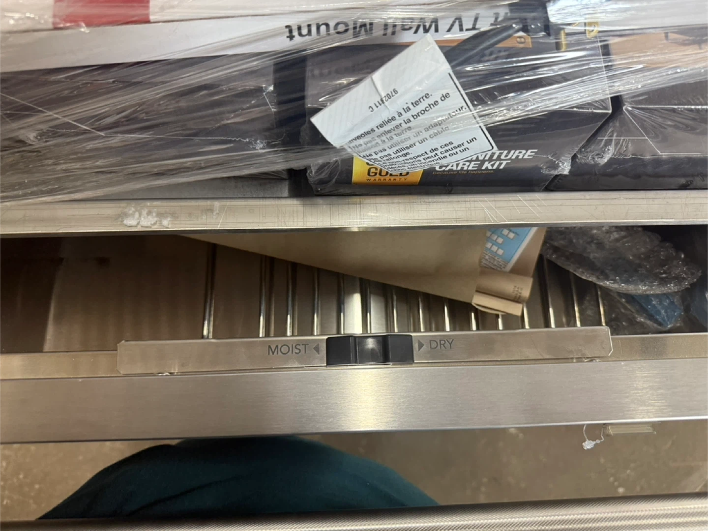 Selling a KitchenAid warming drawer in stainless steel. It looks to be in great condition and still wrapped in plastic! It has a control knob and settings for moist and dry.