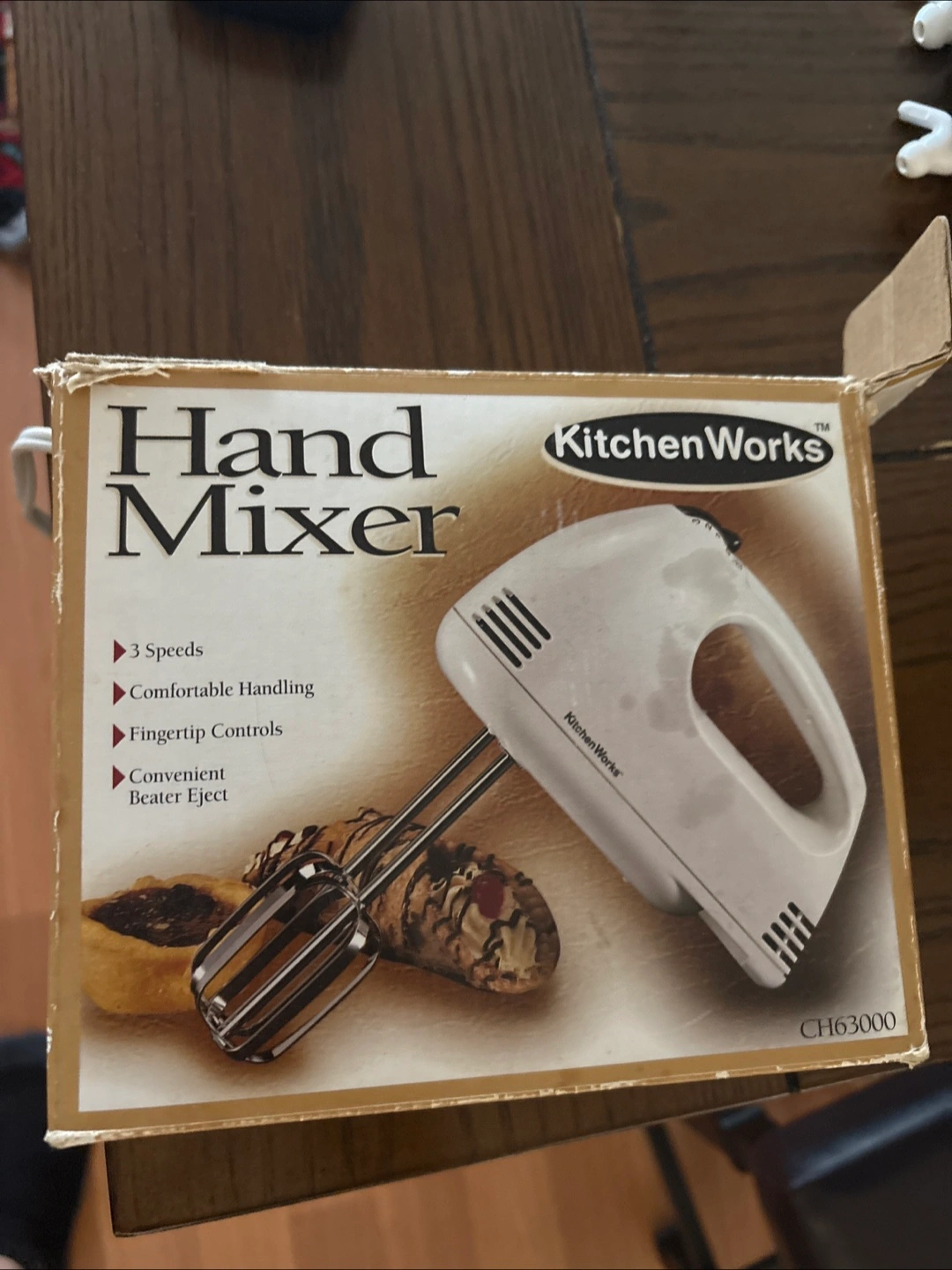 Selling a KitchenWorks hand mixer. It has 3 speeds, comfortable handling, fingertip controls and a convenient beater eject. Model number CH63000