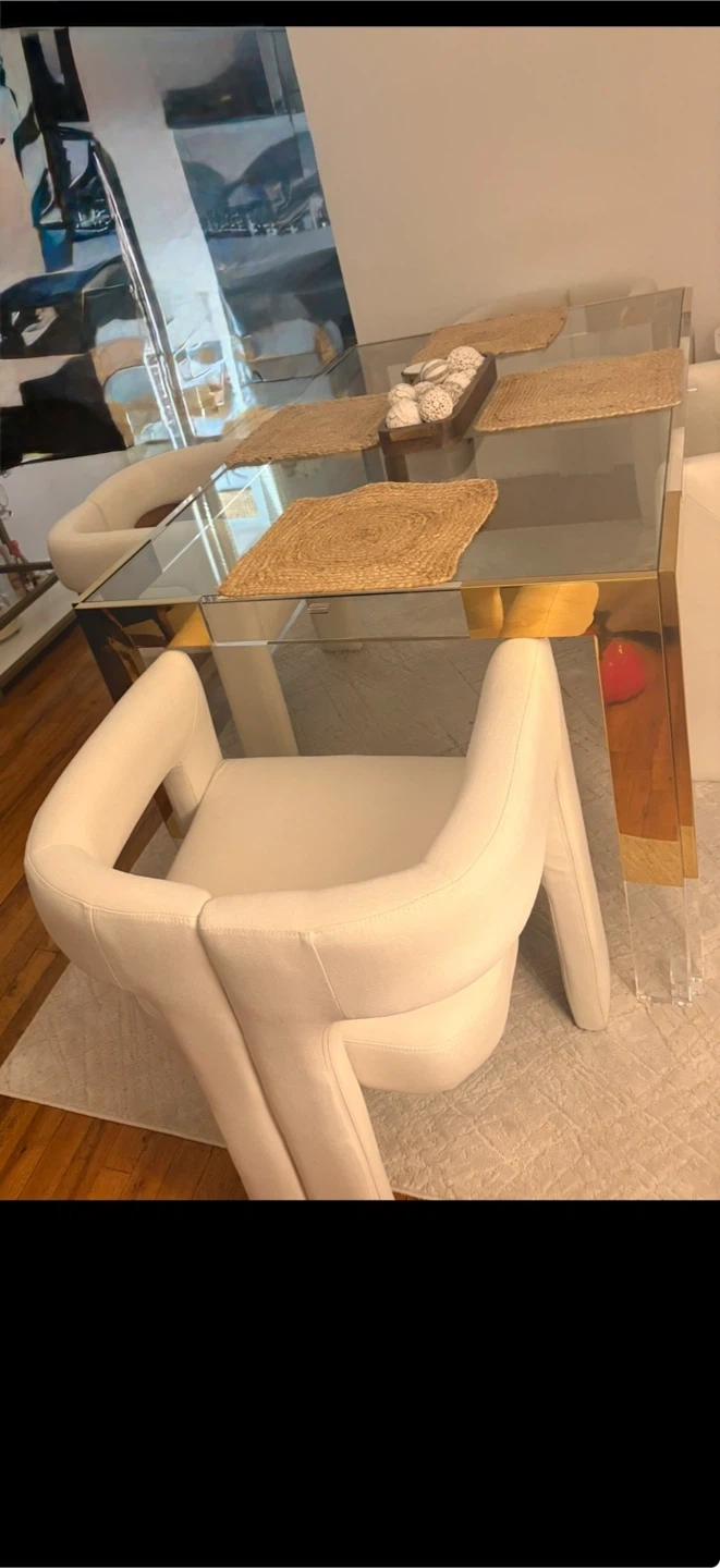 Elegant dining table featuring a clear glass top and polished gold-toned base. It's a stylish centerpiece for any dining room. Measures approximately X" L x Y" W x Z" H. Perfect for hosting dinners!