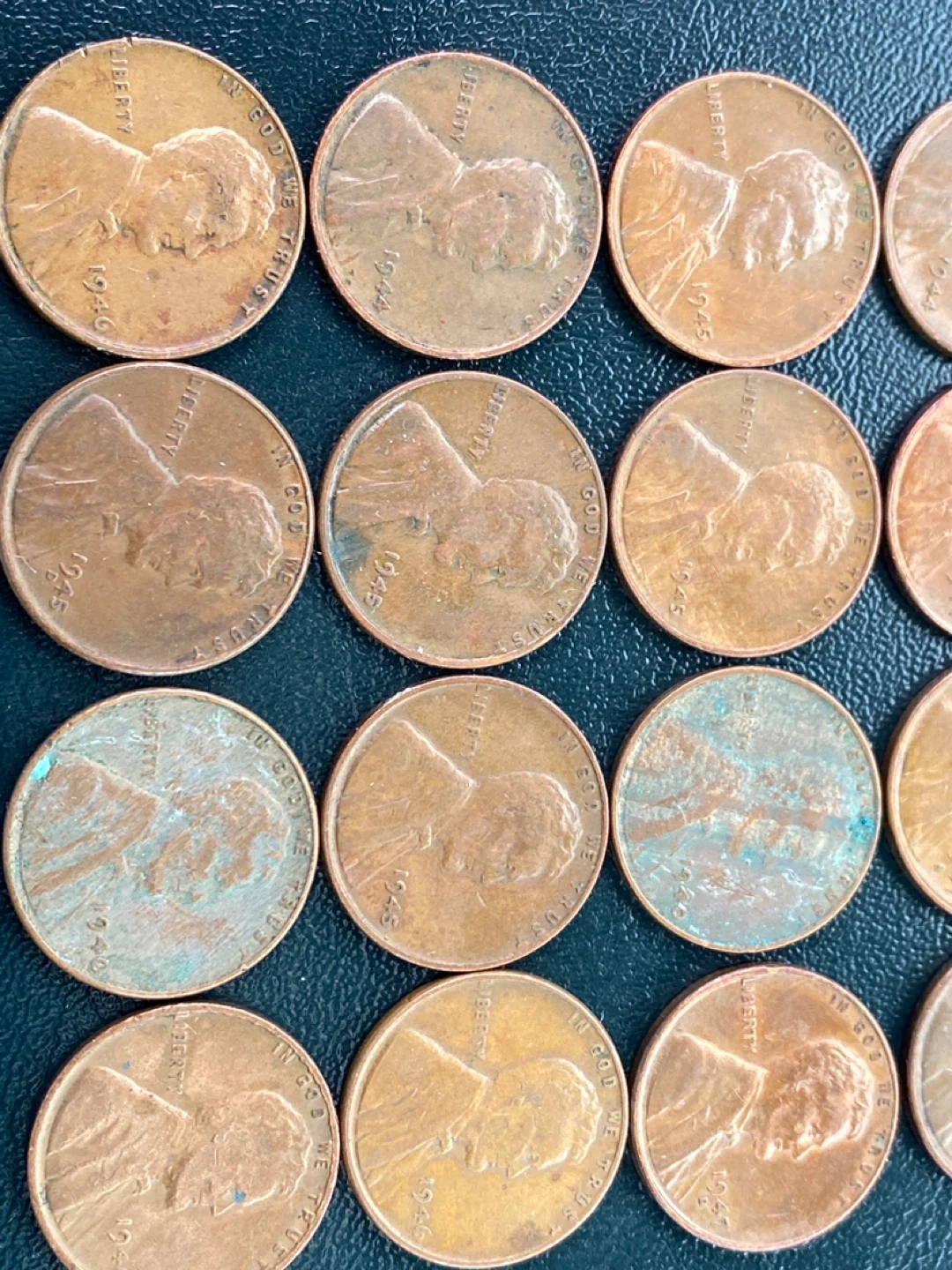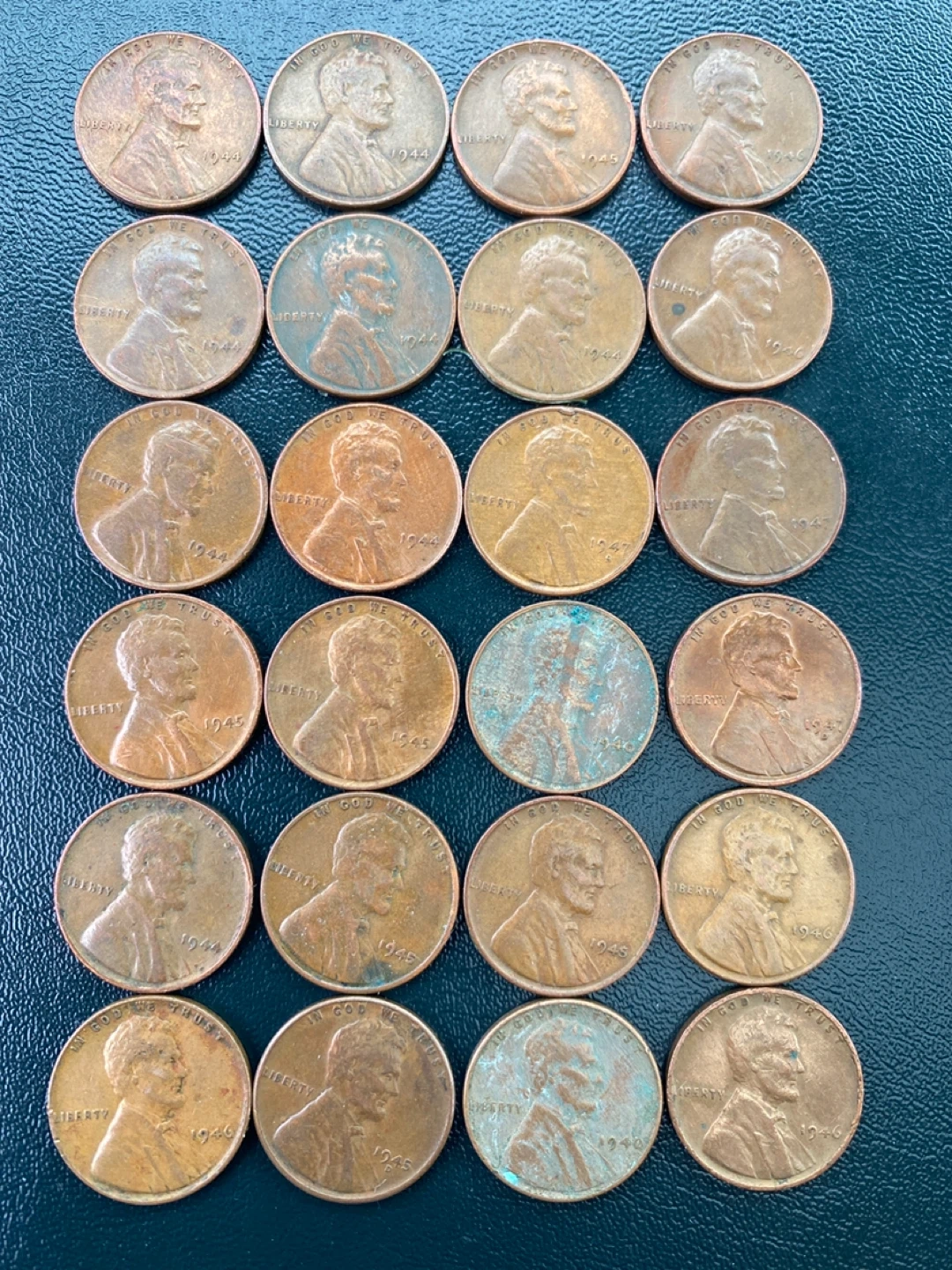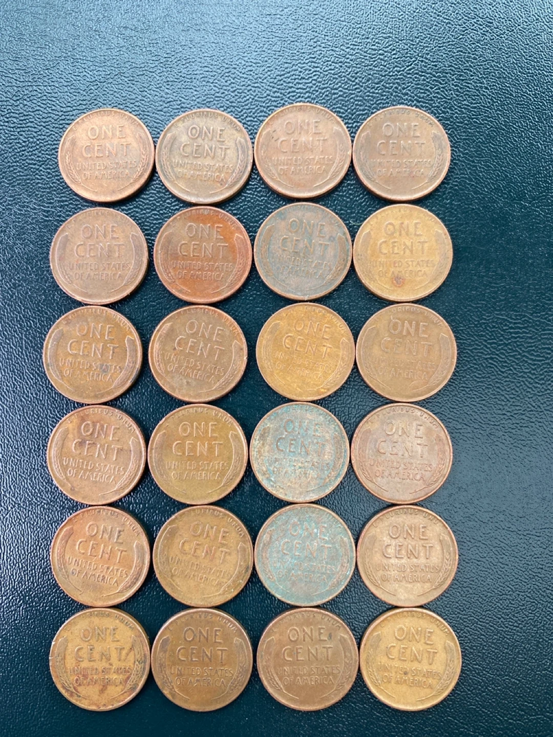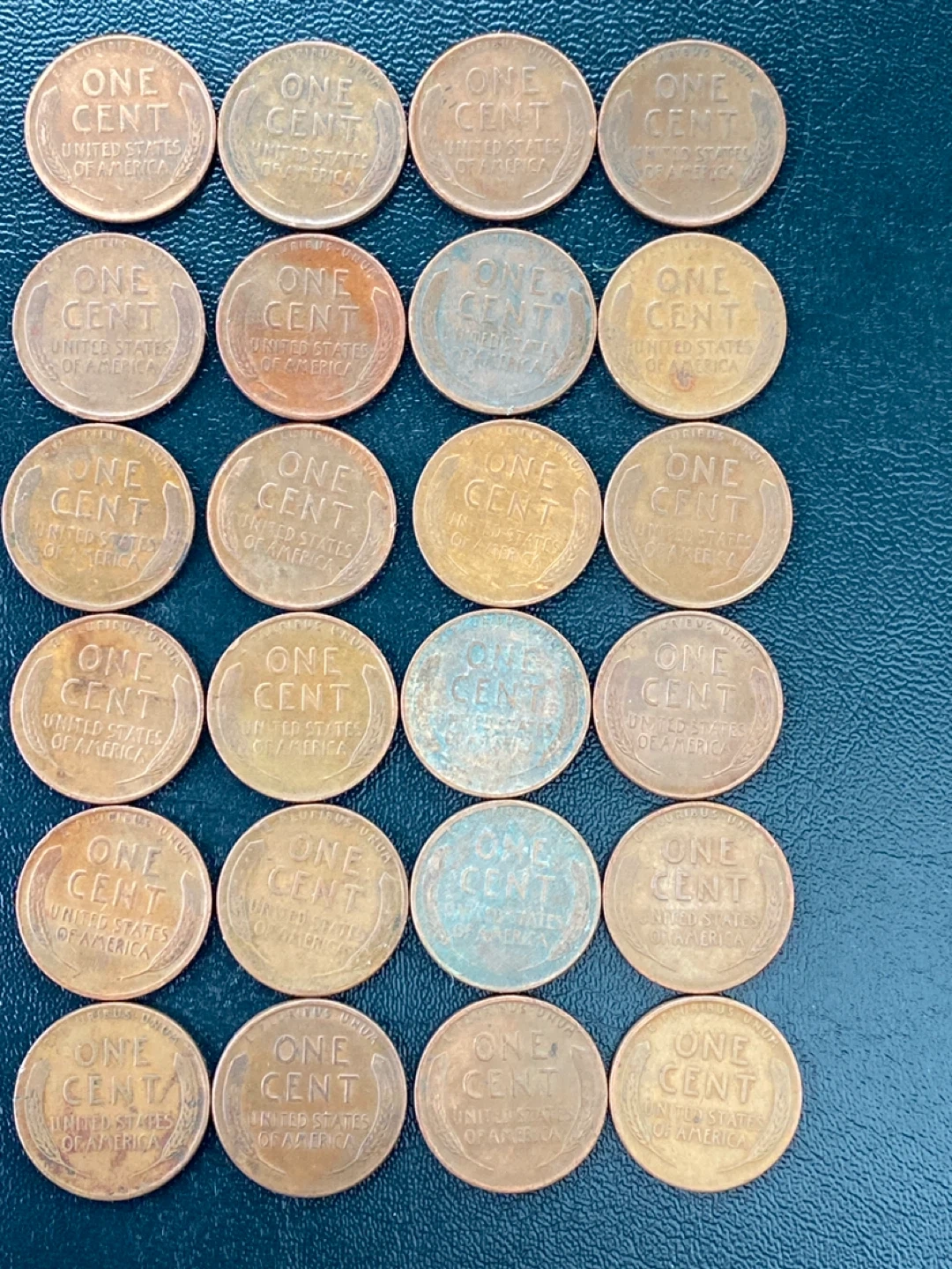 A collection of 25 United States one-cent coins featuring Abraham Lincoln. Many coins show visible dates ranging from the 1940s to the 1950s. Some coins exhibit a patina or verdigris, indicating their age. These pennies are primarily made of copper.