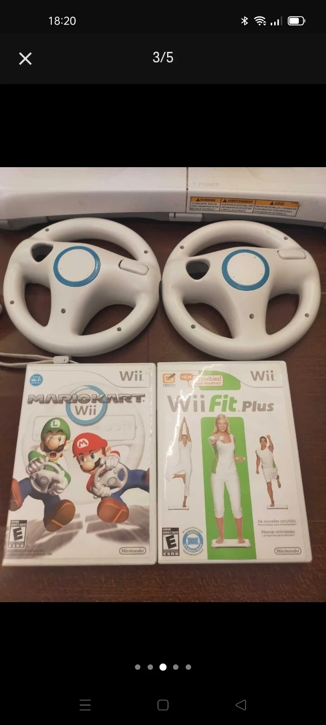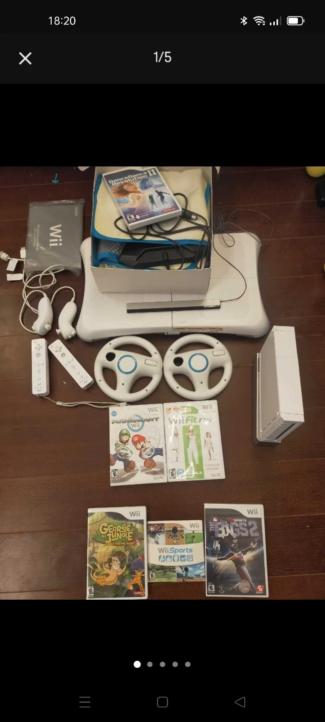 This bundle includes a Nintendo Wii console, multiple controllers, two steering wheels, and several games. Games included are Mario Kart Wii, Wii Fit Plus, Wii Sports, The Bigs 2, and George of the Jungle. It's a great package for family fun!