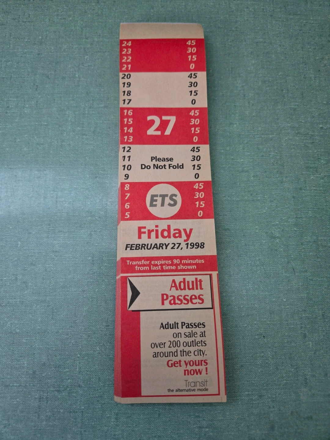 ETS adult paper bus passes are dated Friday, February 27, 1998