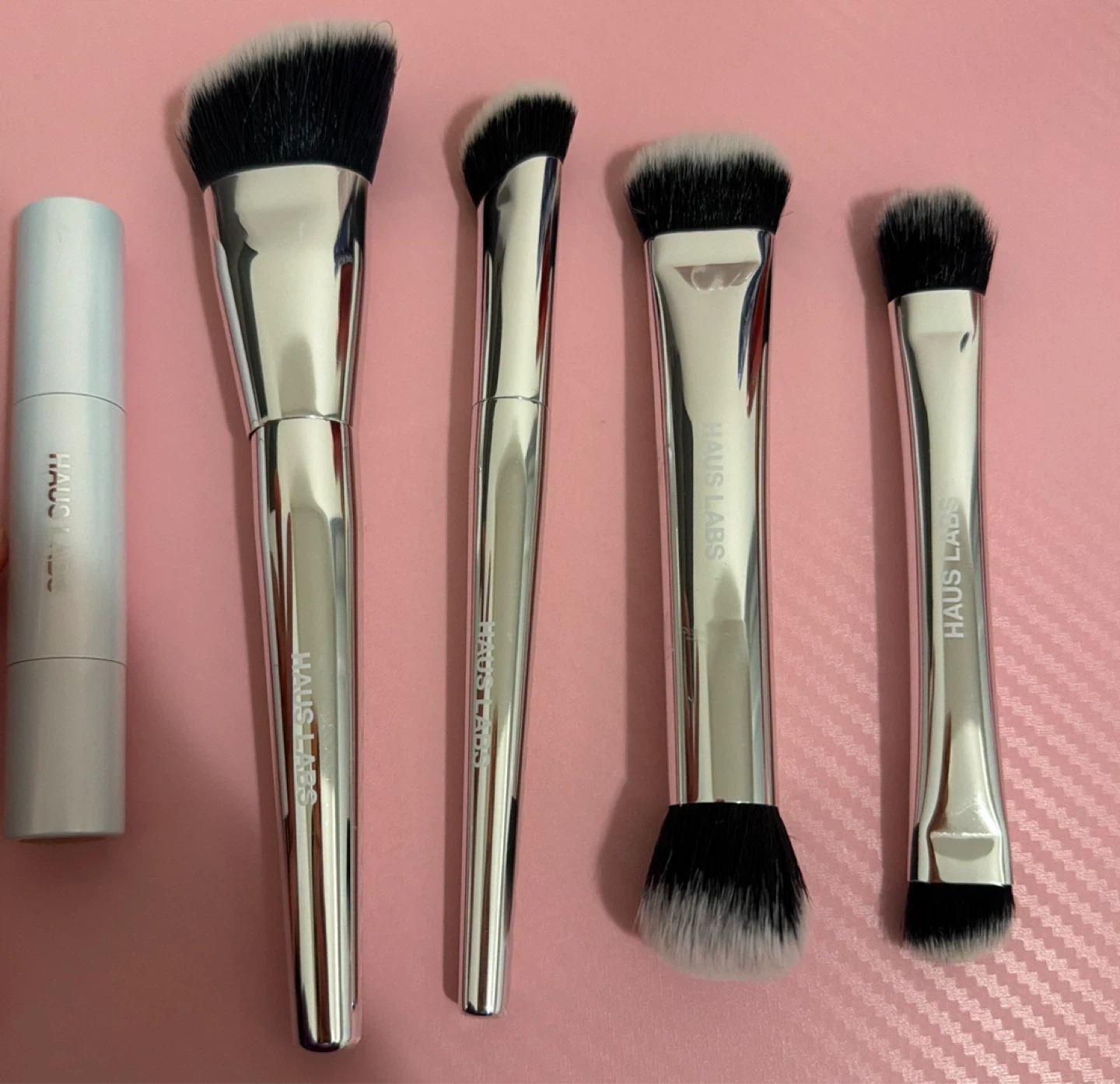 This set includes four HAUS LABS makeup brushes with silver handles. It also comes with a silver cosmetic brush holder. Ideal for applying and blending makeup with highlighter & lip oil