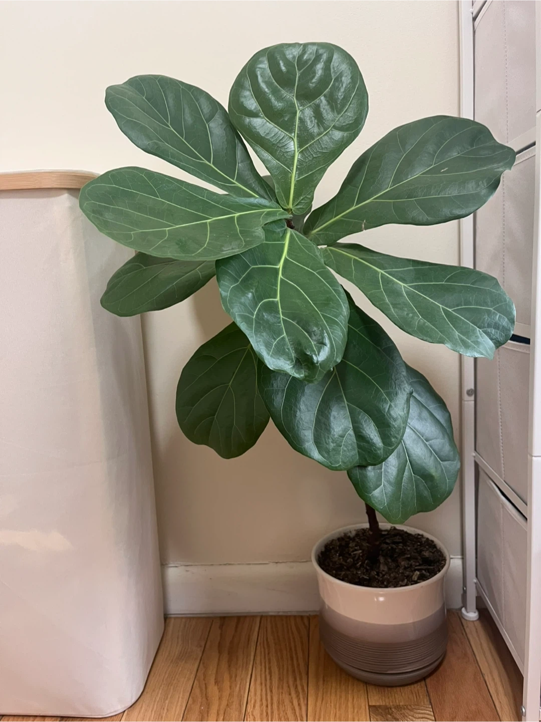 Healthy fiddle leaf fig plant in a stylish ceramic pot. The pot features a tri-color design with a ribbed texture at the base. This plant adds a touch of green to any indoor space. Perfect for bringing a bit of nature indoors!