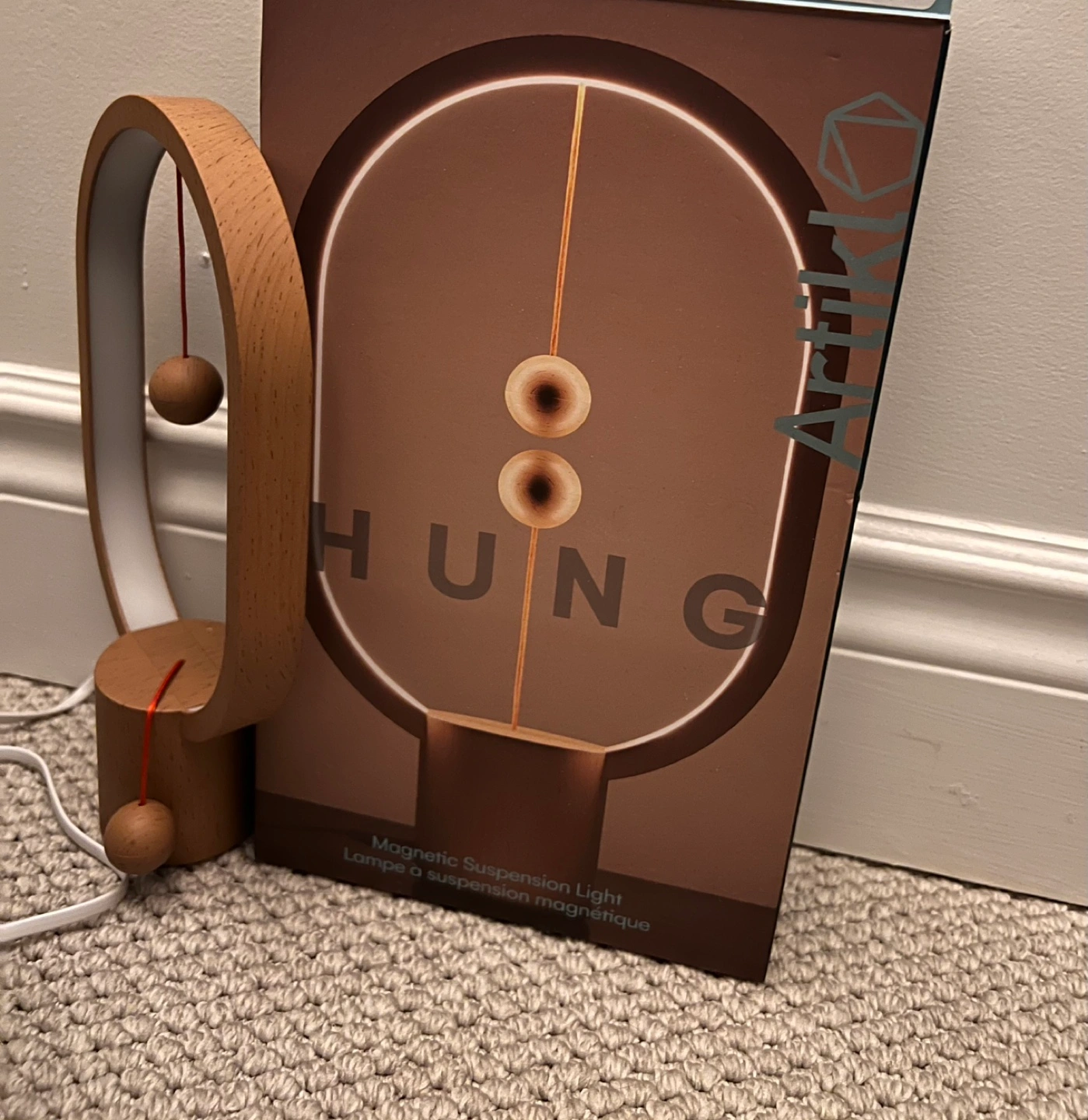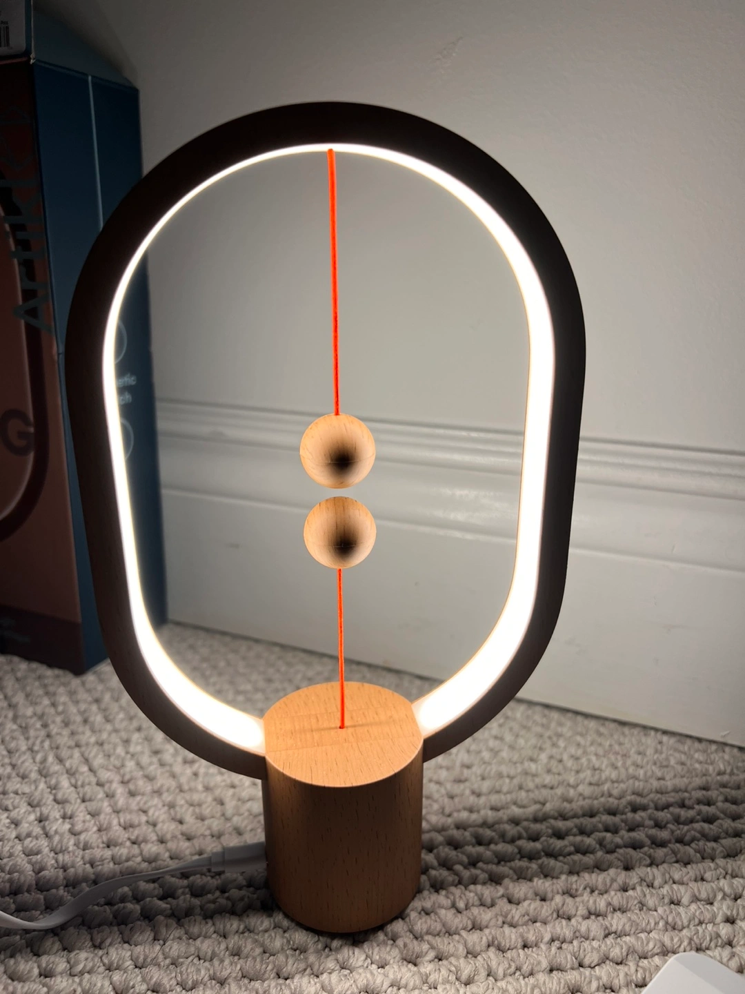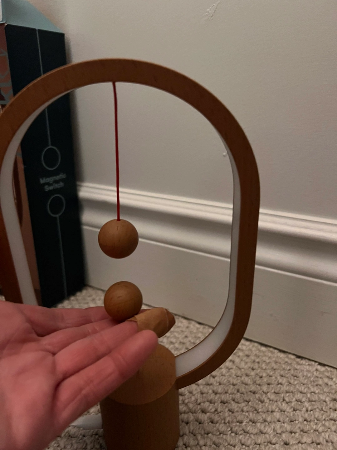 Unique wooden desk lamp and conversation piece! Features magnetic suspension. When the 2 balls connect the light goes on. Never been used only taken out and turned on for photos. Includes original box and usb cord.