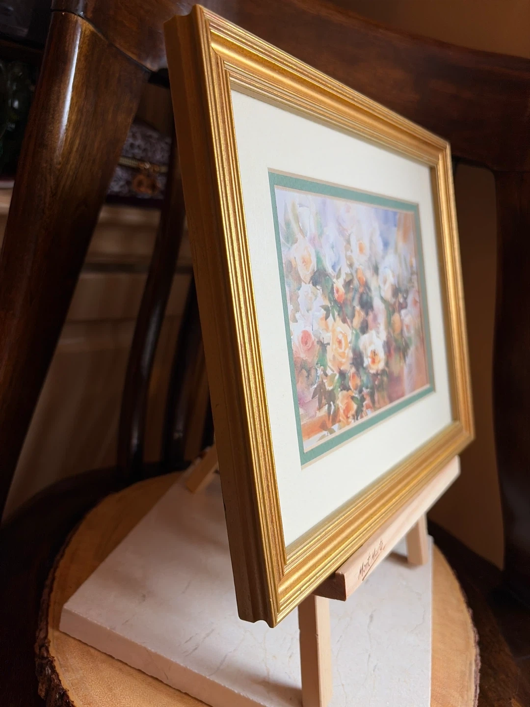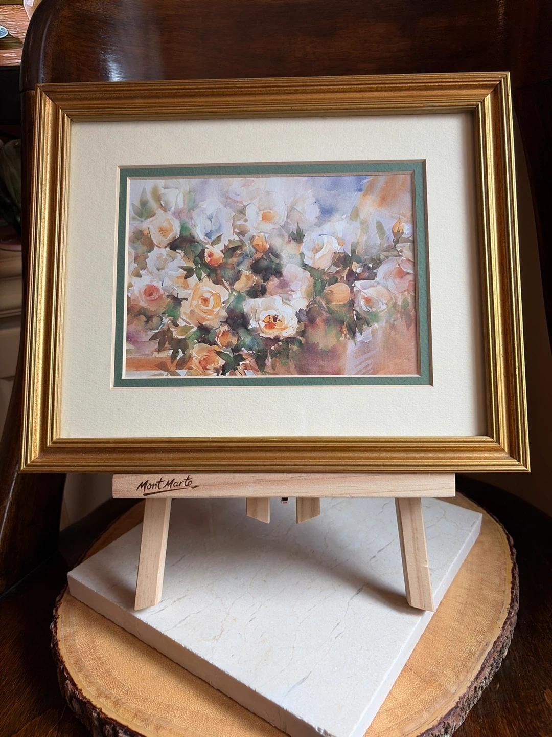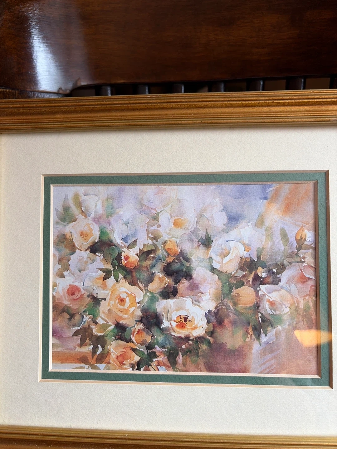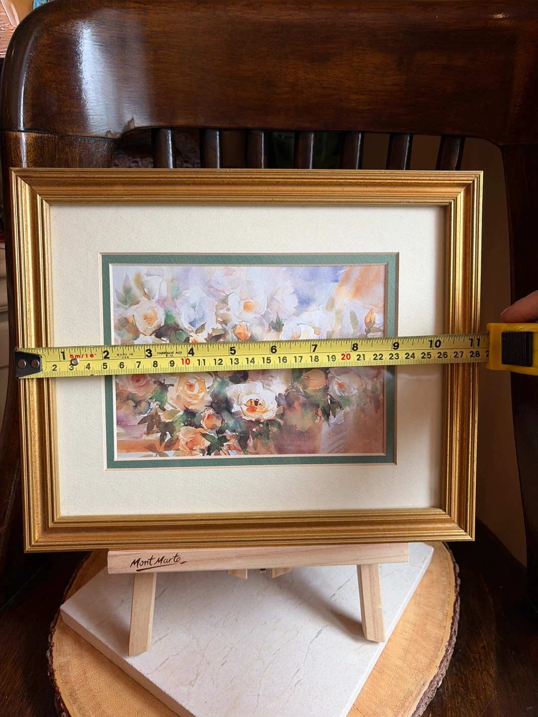 Watercolour print of a floral arrangement in a gold-toned frame. Features an ivory matting and a green accent border. The florals are light peach colour with green leaves. It is 11” wide and 9” tall. It has a sawtooth hanger in the back for easy hanging or could be displayed on an easel as I have. A really pretty floral piece!