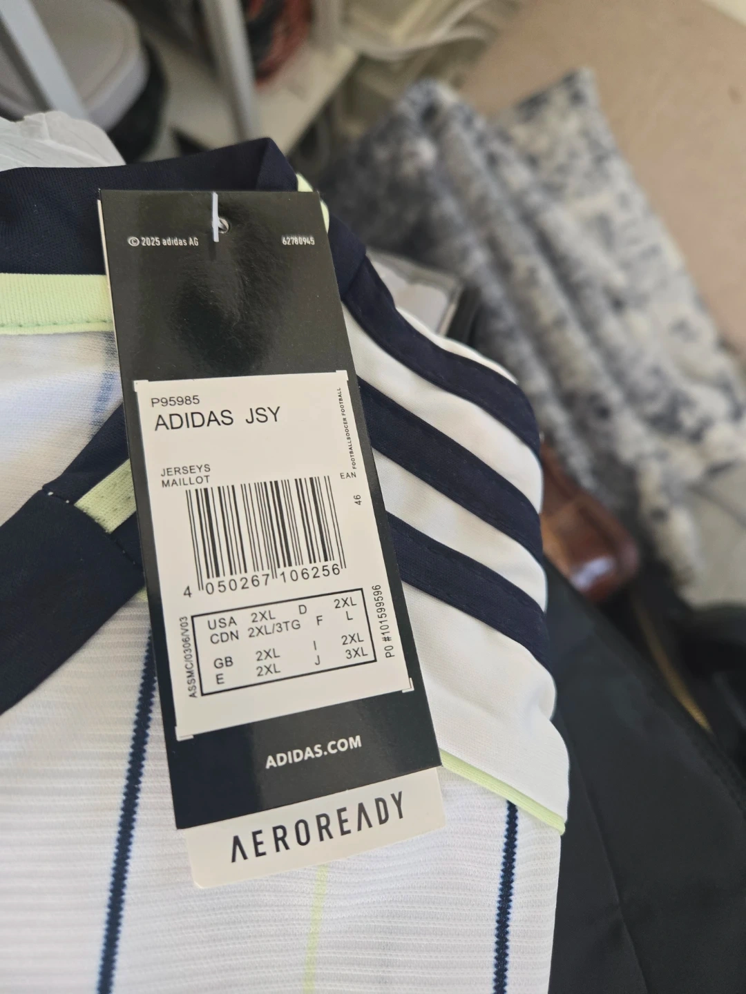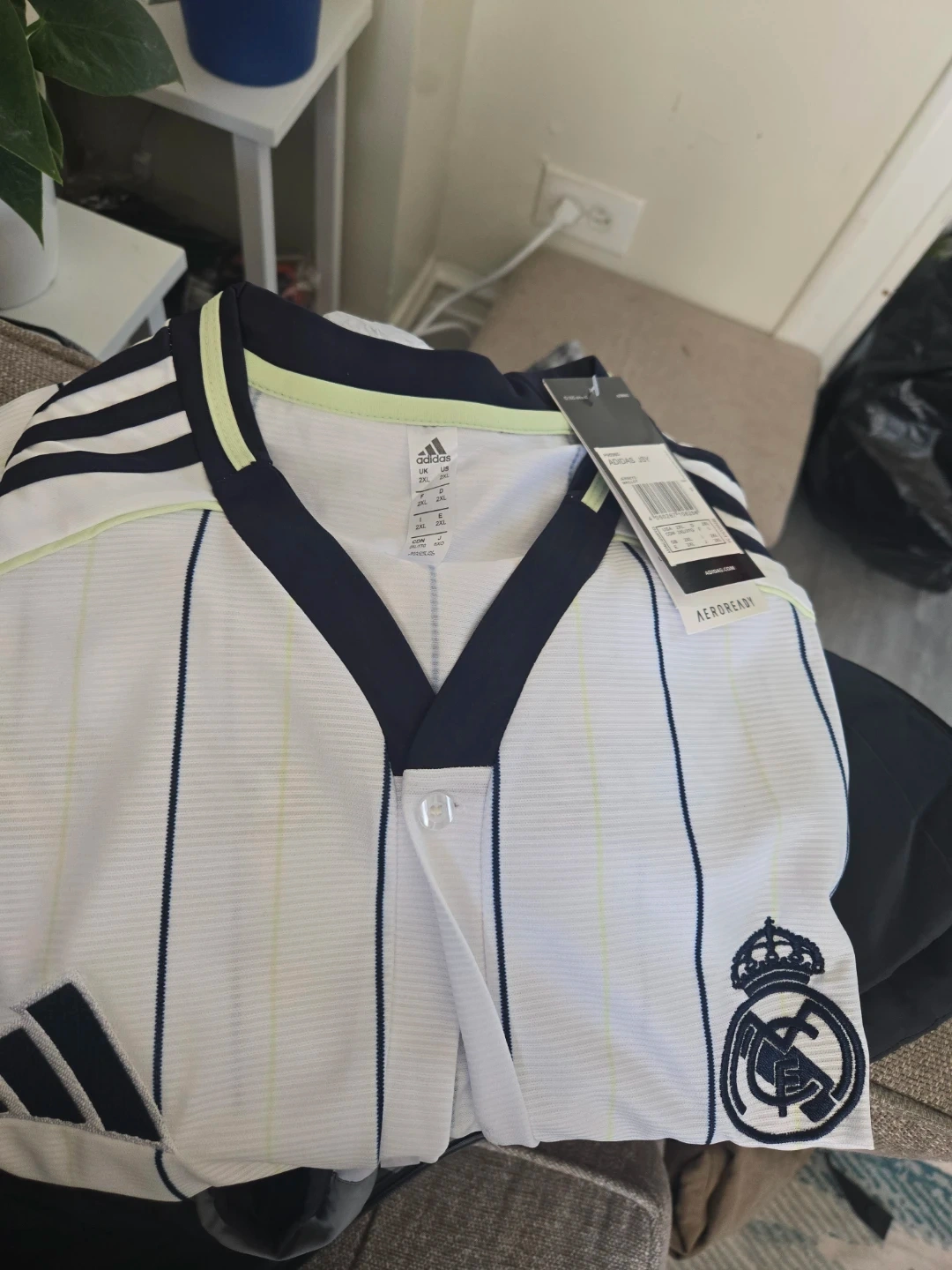 This is a new Adidas Real Madrid football jersey in size 2XL. It's made with Aeroready technology for moisture-wicking. The jersey features the club crest and classic Adidas stripes.