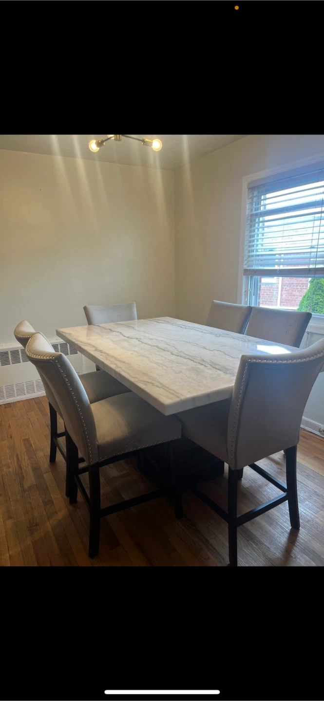 Counter height dining table with a genuine marble top & table base Includes original box never open Assembly required.