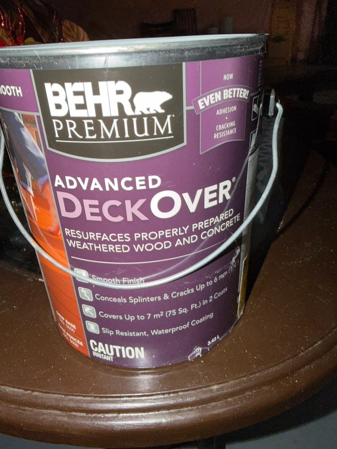 BEHR PREMIUM ADVANCED DECKOVER deck and concrete resurfacer. This paint offers a smooth finish, conceals splinters and cracks up to 6 mm, and covers up to 7 m² in 2 coats. It's slip resistant and waterproof! Great for properly prepared weathered wood and concrete surfaces.
