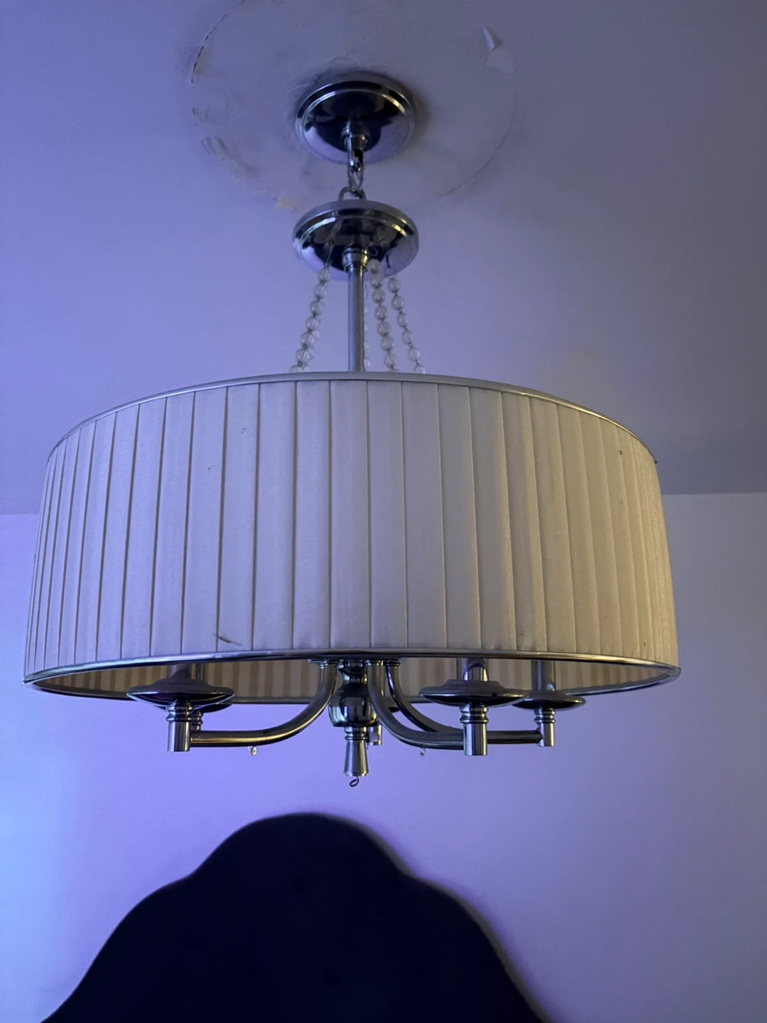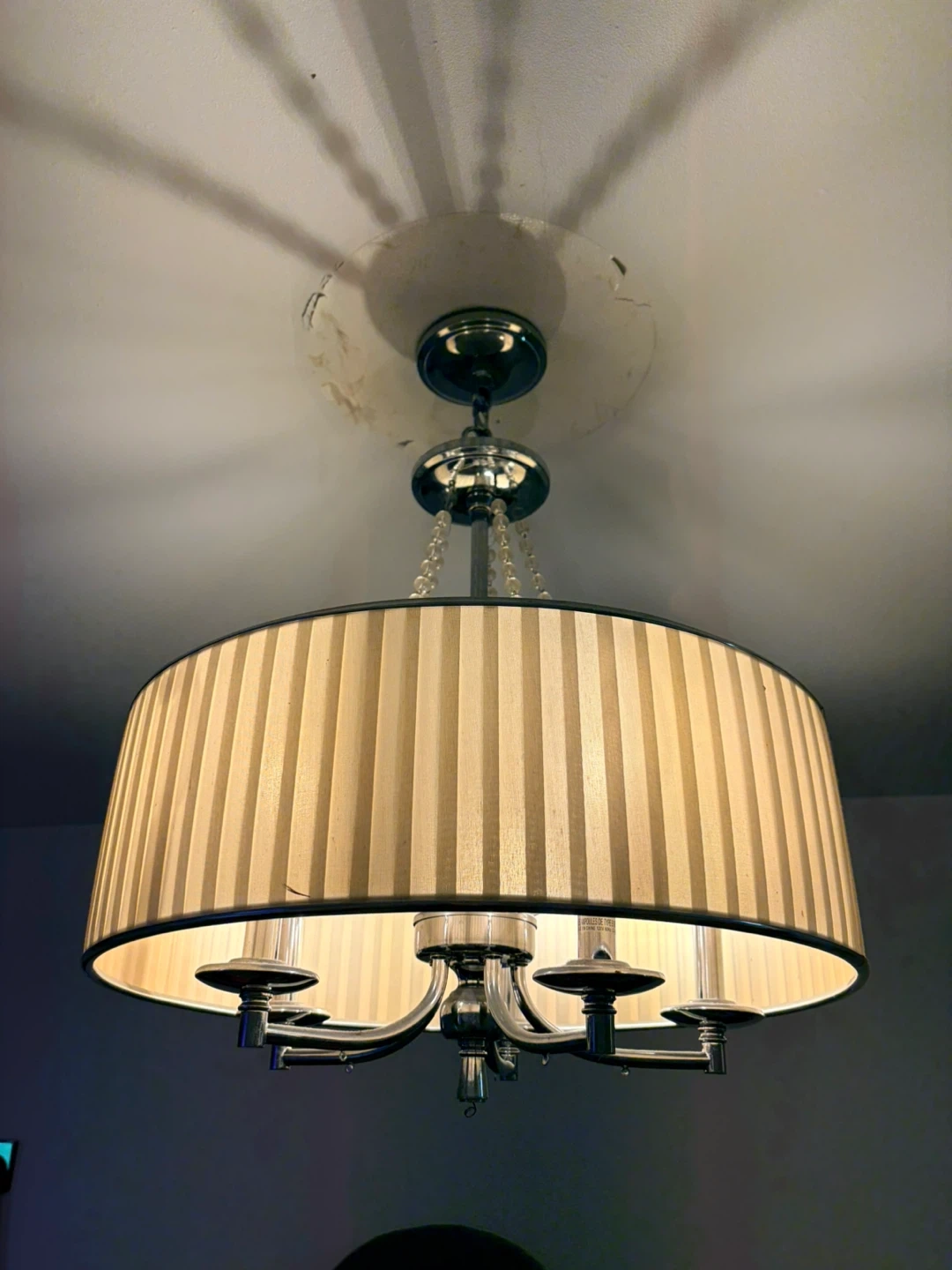 This elegant chandelier features a cream-coloured drum shade with vertical pleating and decorative beaded strands. It has a brushed nickel finish and accommodates four bulbs. Perfect for adding a touch of style to a room.