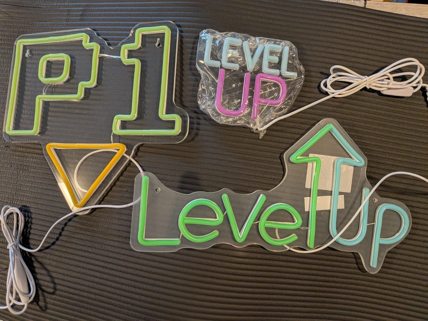 Set of three neon signs. Includes 'P1' with a yellow triangle, and two 'Level Up' signs in different styles. Great for a game room or entertainment space!