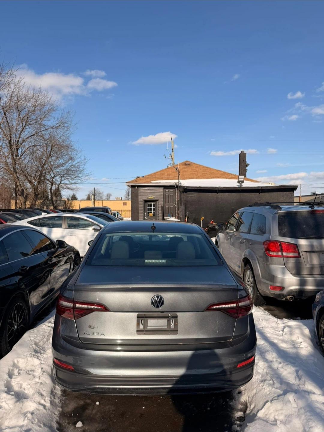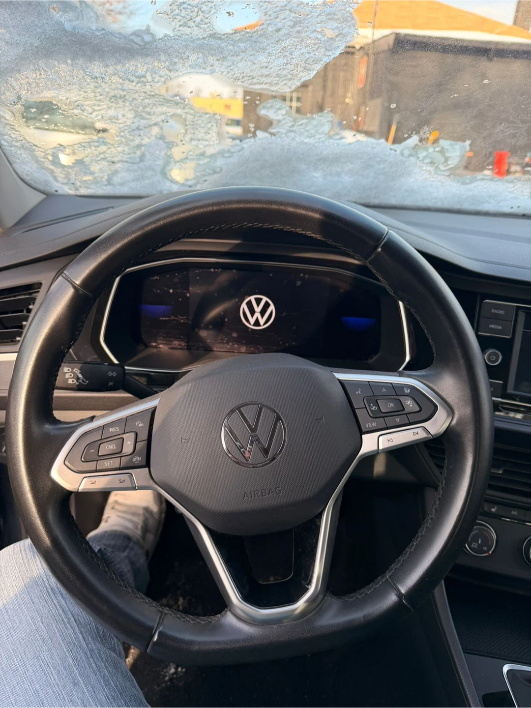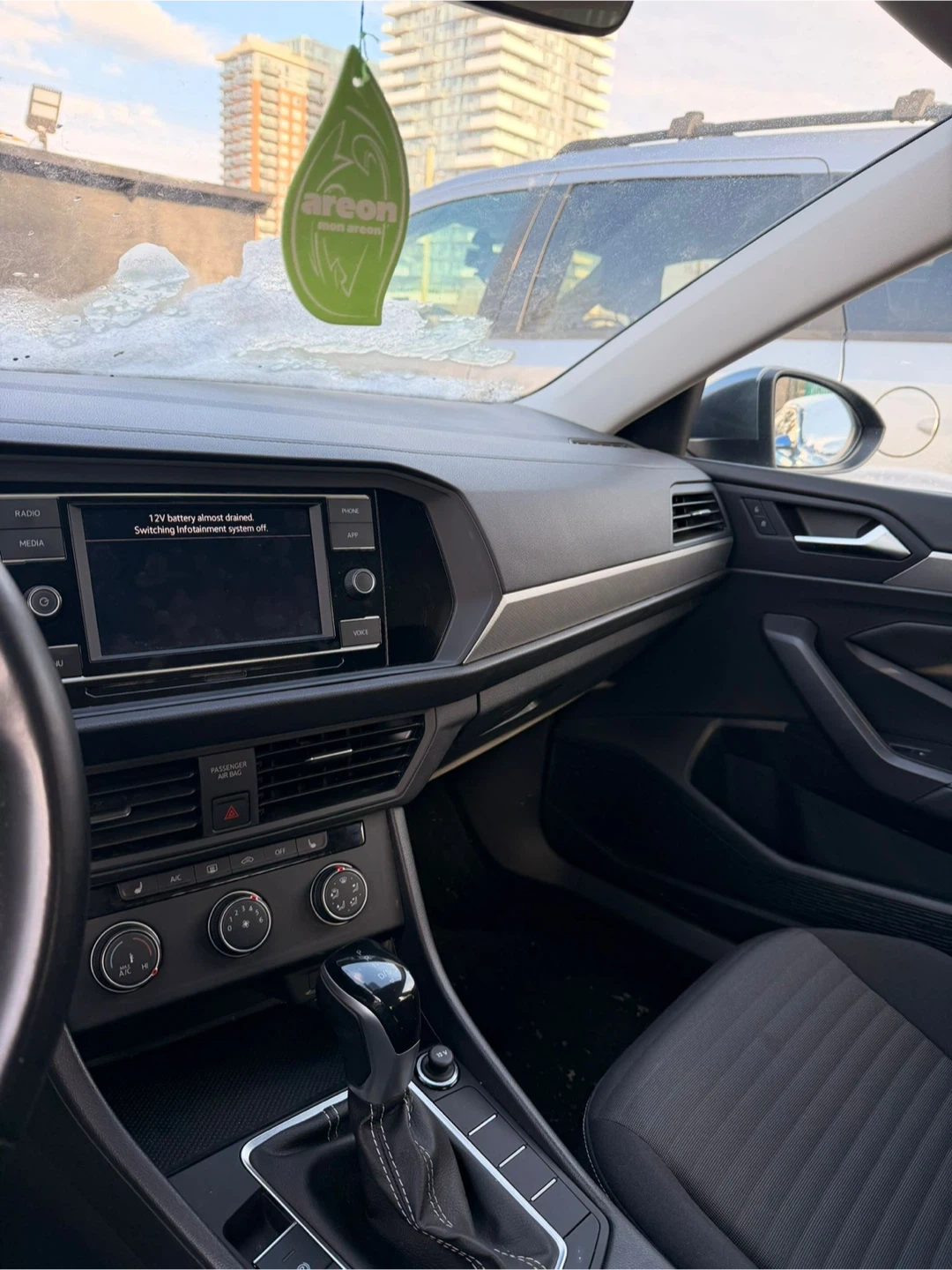 This is a grey Volkswagen Jetta sedan. It features a black leather steering wheel and interior. The digital dashboard shows a battery warning message.