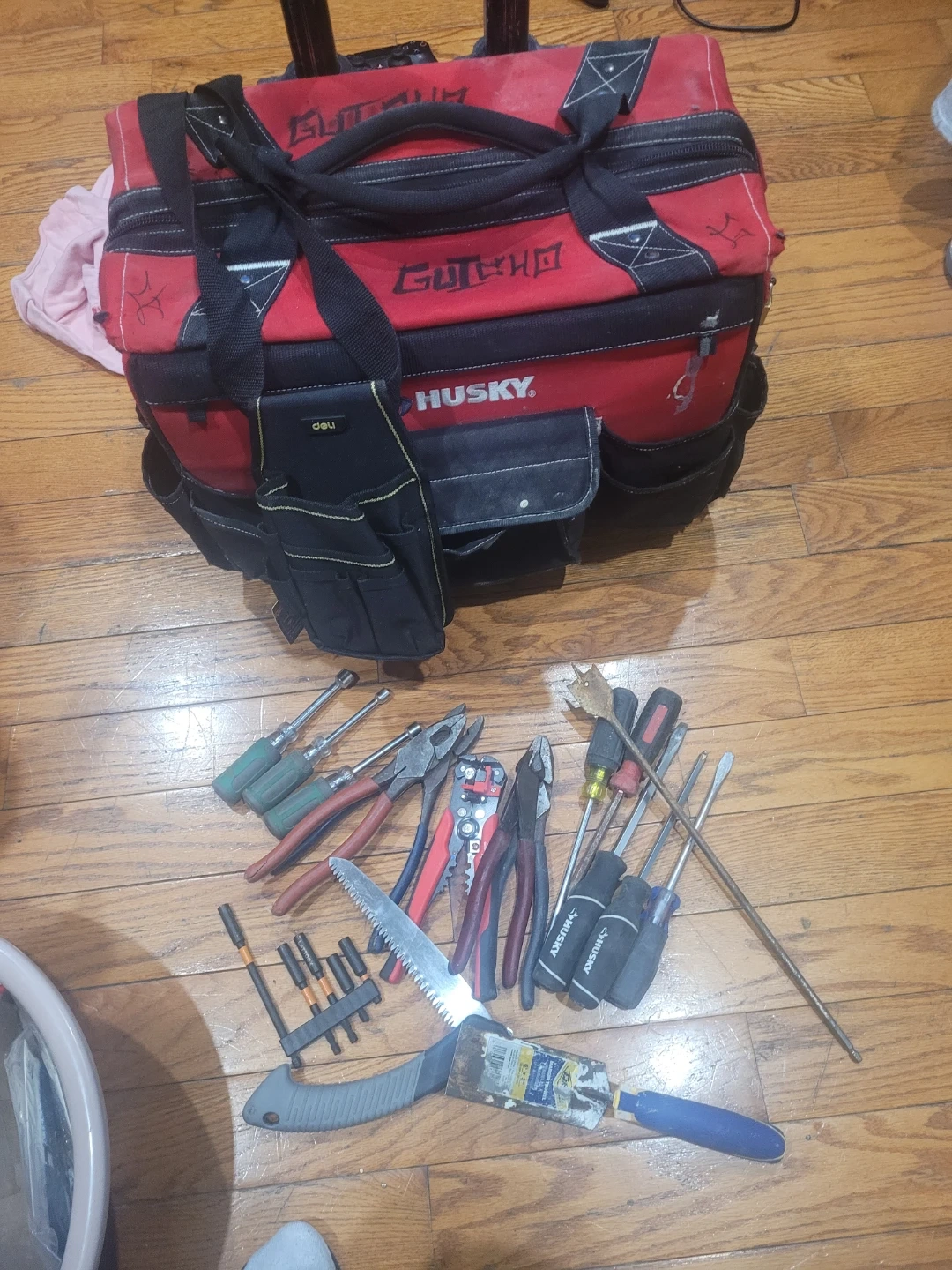 This red and black Husky rolling tool bag comes with a variety of hand tools. Includes screwdrivers, pliers, a saw, and more. It's a convenient set for various projects!