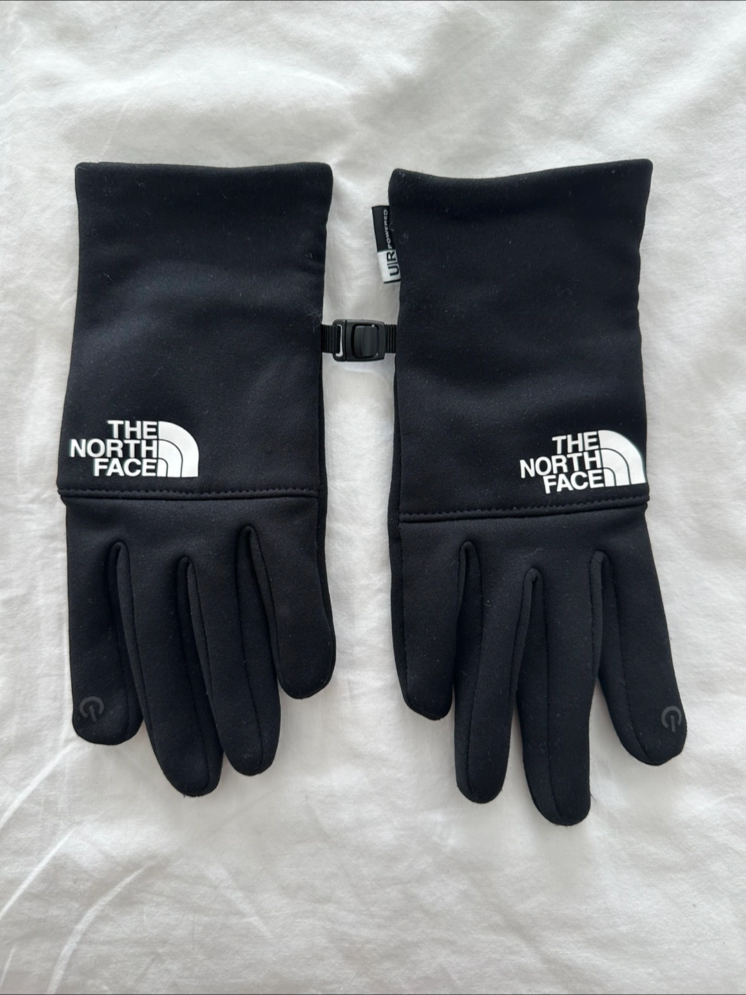 These are The North Face Etip gloves in black. They're size S/P and made with 93% polyester and 7% elastane. The palms have grippy texture for better hold. They feature a power button logo, indicating touch screen compatibility.