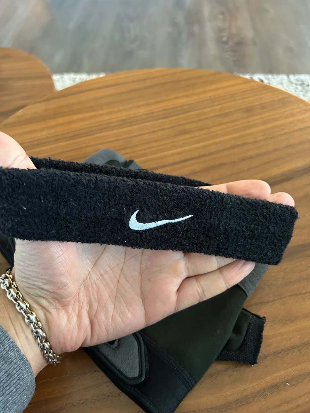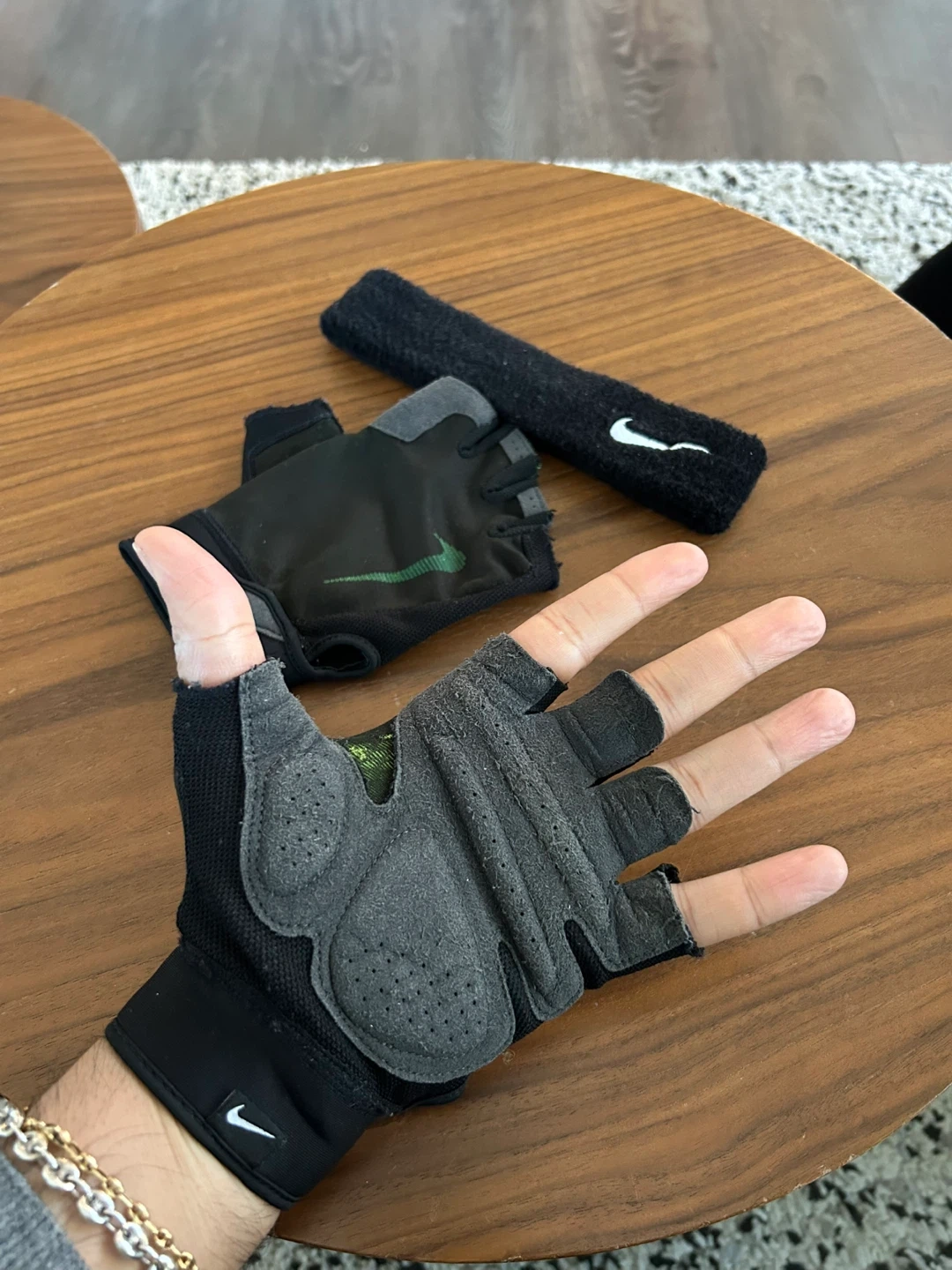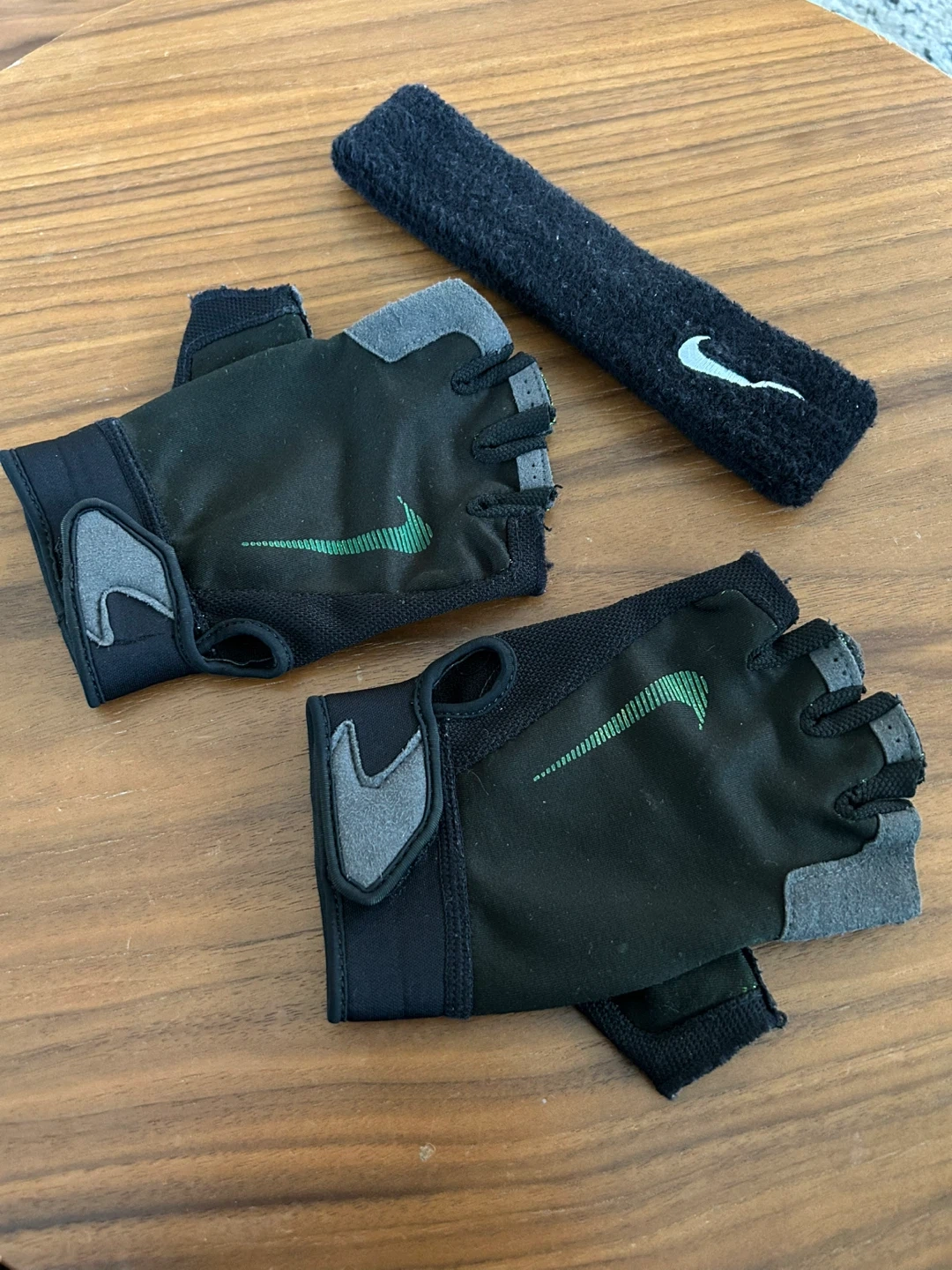 Selling a pair of Nike training gloves and a matching headband. Both items are in good condition and ready for your next workout! The headband was bought at Decathlon. Perfect for gym workouts or any fitness activity!