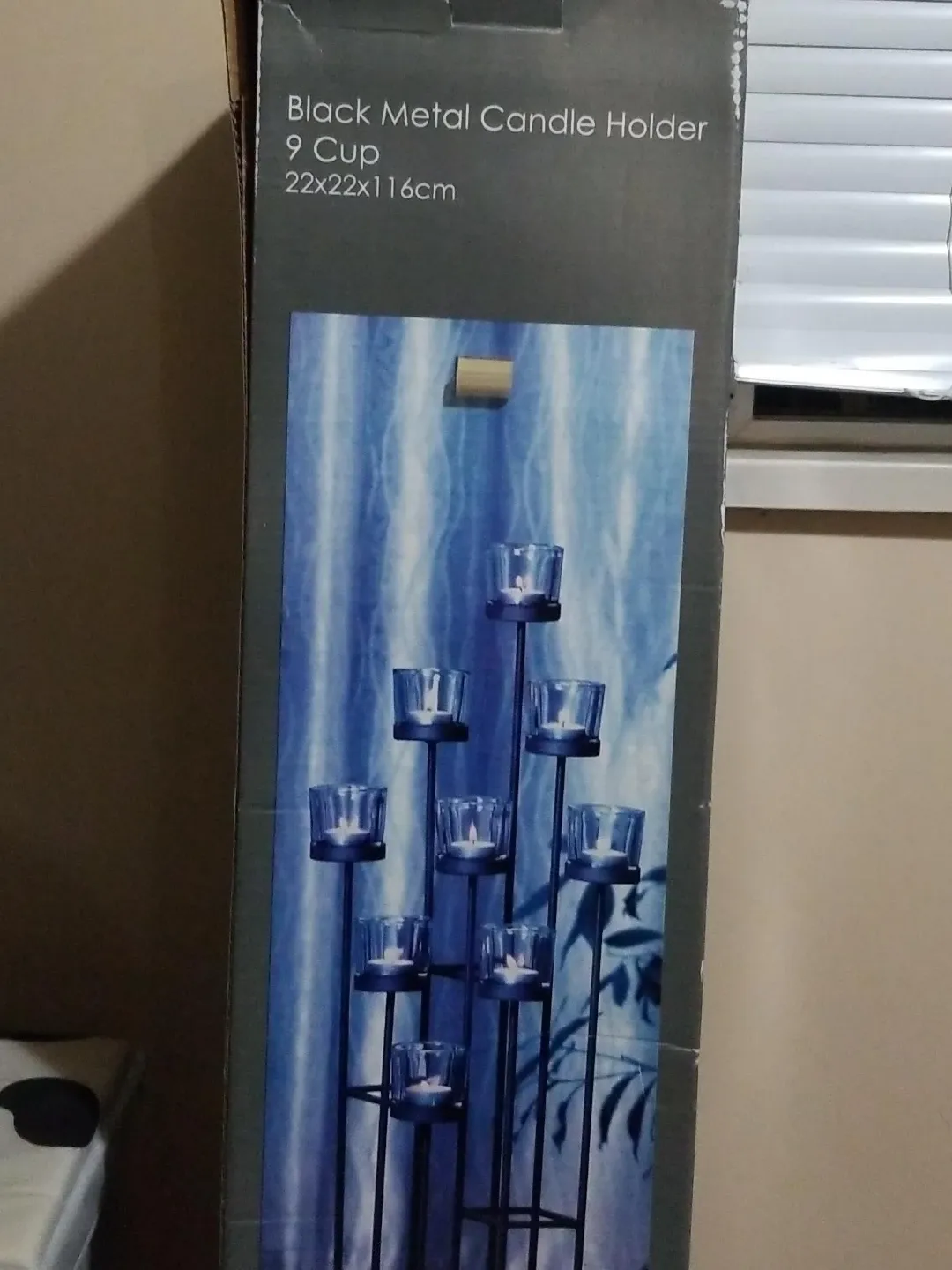 Black metal candle holder with 9 cups. Metal construction. Dimensions are 22x22x116cm. It's a tall centrepiece for multiple tea lights!