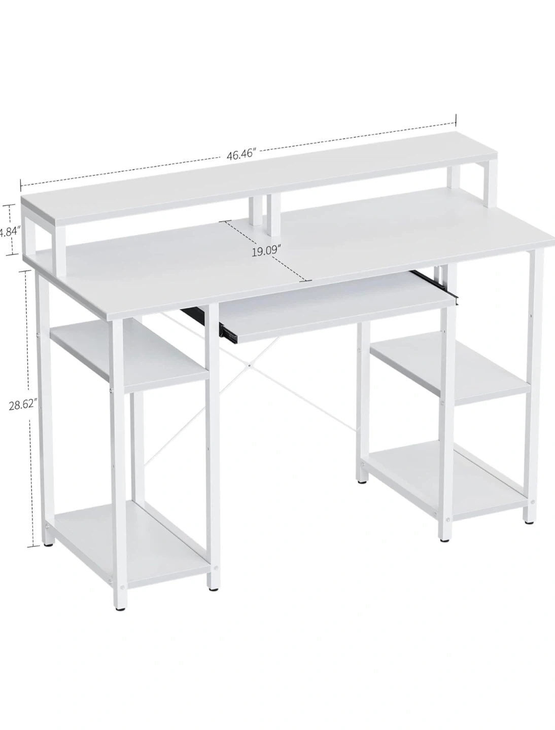 A white computer desk with detachable monitor stand, multiple shelves for storage. It has a built-in keyboard tray. The desk is perfect for a home office or study setup.