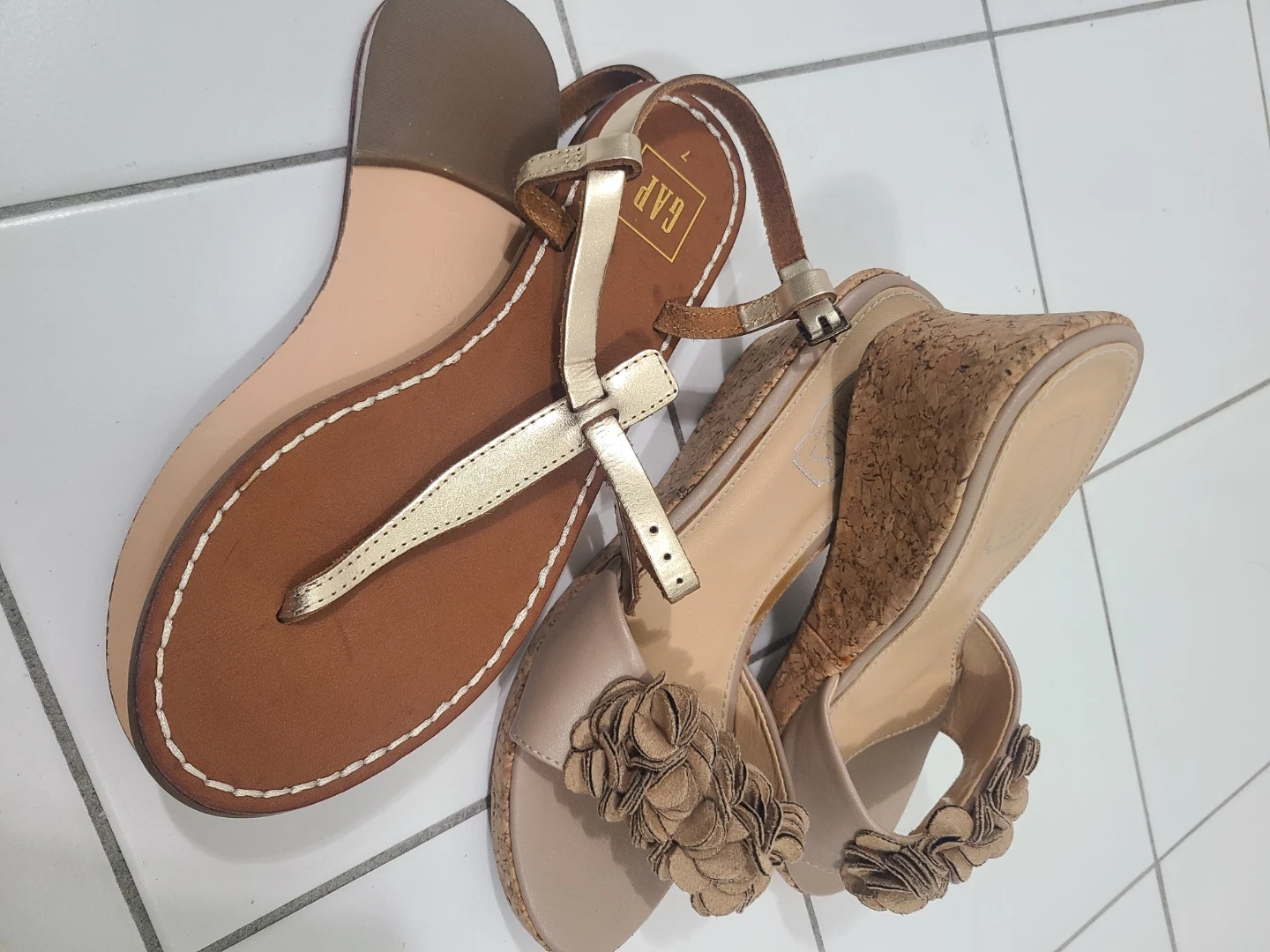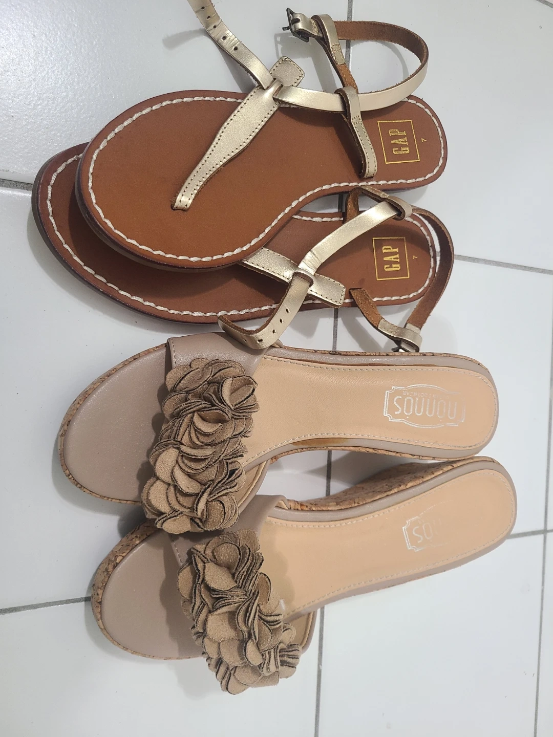 Two pairs of sandals for sale! One pair is from Gap, size 7, with a brown and gold colour scheme. The other pair is from Souuu, size 7, featuring a beige colour and floral detailing