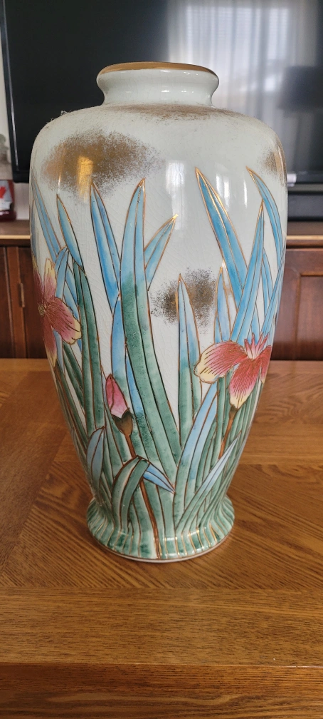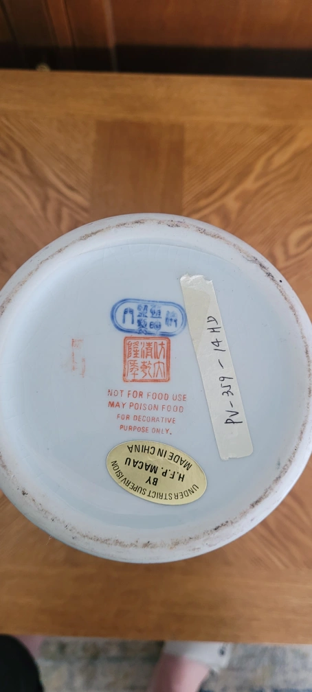 Tall porcelain vase with blue and green flower designs and gold accents. Made in China by H.F.P Macau. Not for food use. Decorative purposes only.