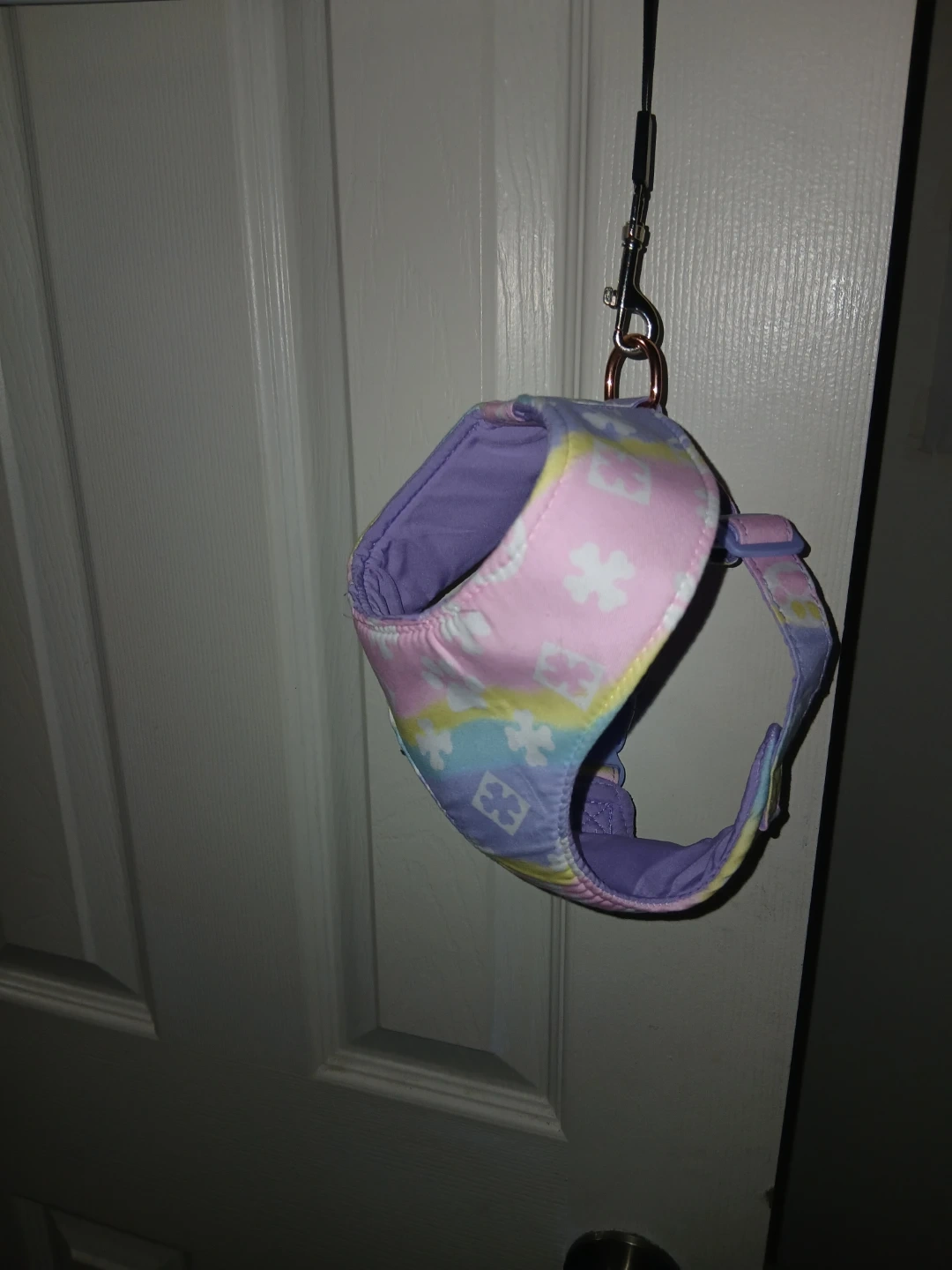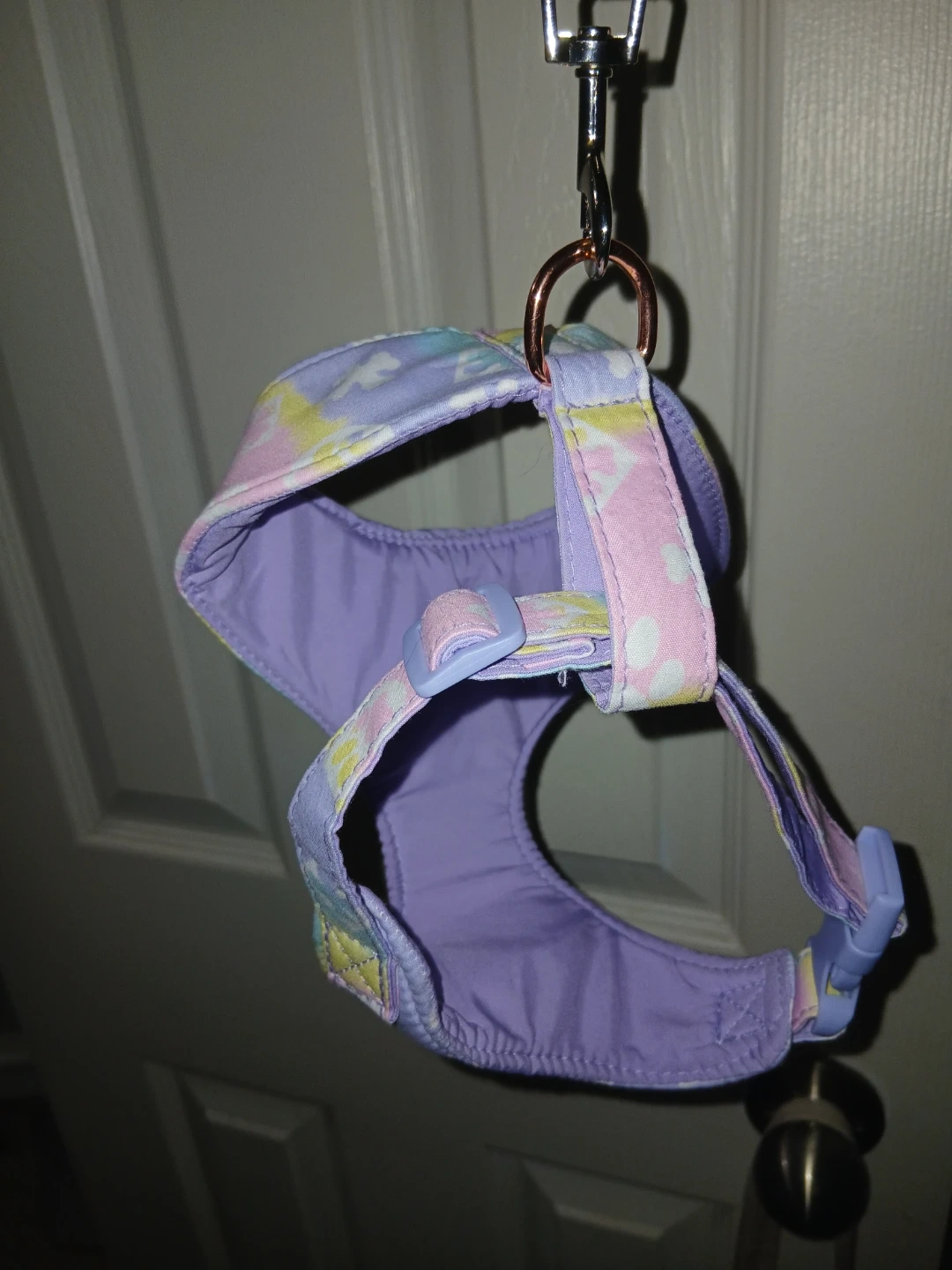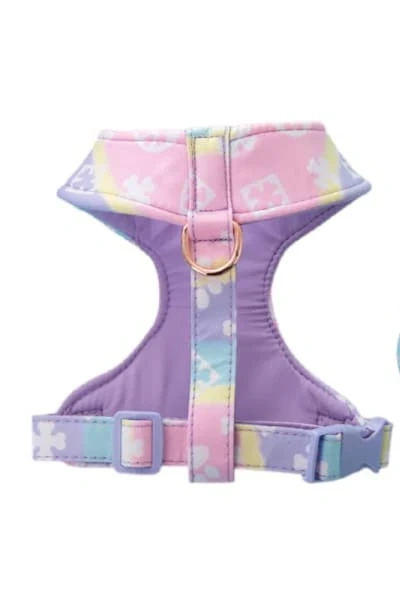 This dog harness has a pastel tie-dye pattern with floral accents & includes an adjustable strap. It's designed for comfort and style for your furry friend! + Leash (Last Photo)