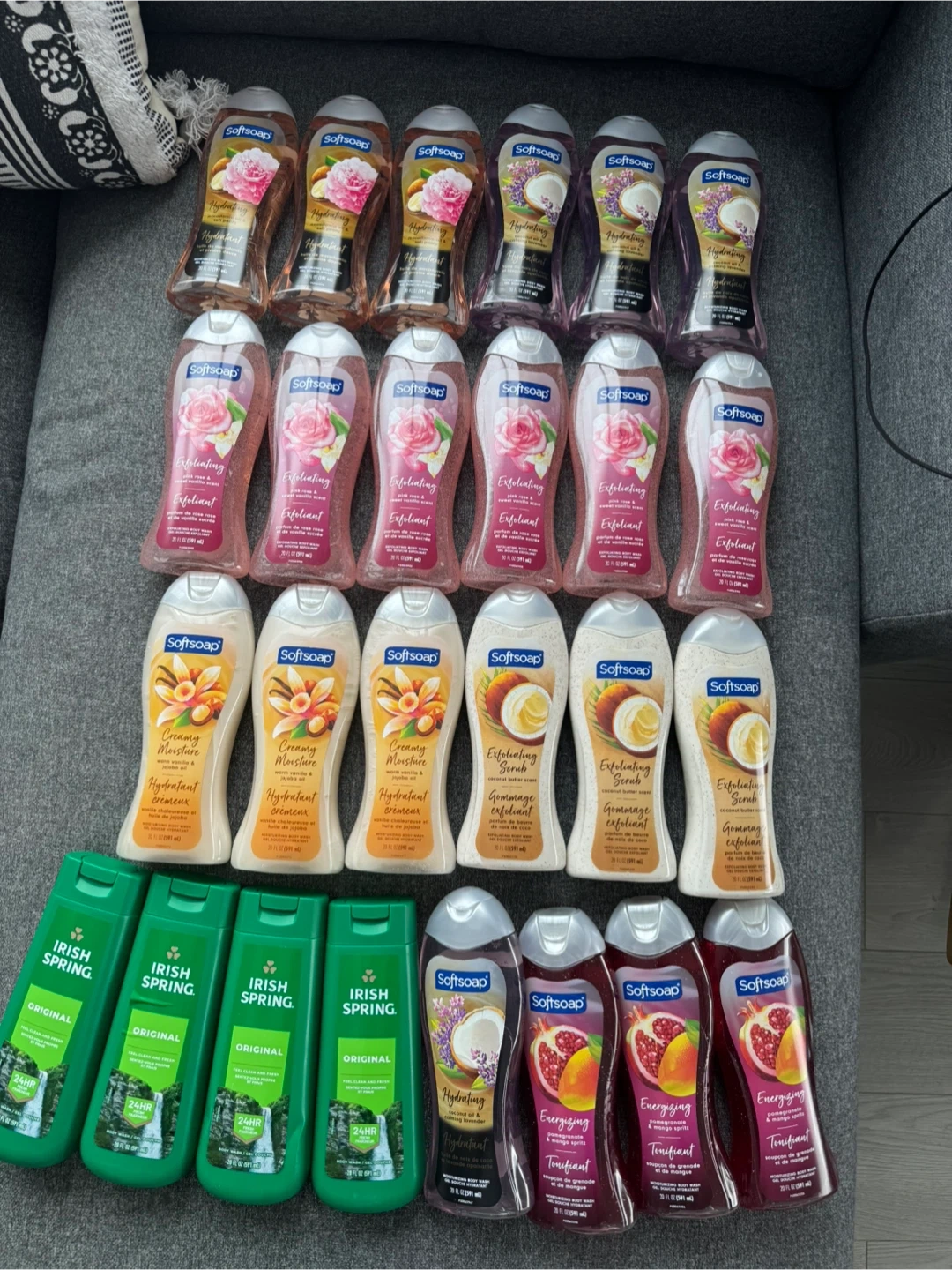 This lot includes a variety of Softsoap Hydrating, Exfoliating, and Creamy Moisture body washes, as well as Irish Spring Original body wash. Available scents include pink rose & vanilla, warm vanilla & almond, coconut butter cream, lavender & honey, and pomegranate & mango spirits. Each bottle is 20 FL OZ.