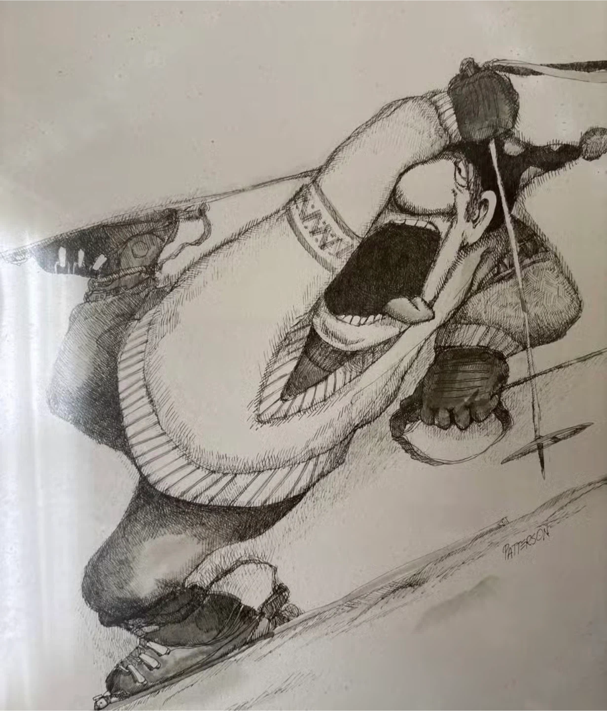This framed art print features a whimsical drawing titled "The Moguls," signed by Patterson. It captures a skier navigating a bumpy slope with exaggerated style. Perfect for a ski enthusiast's home decor!