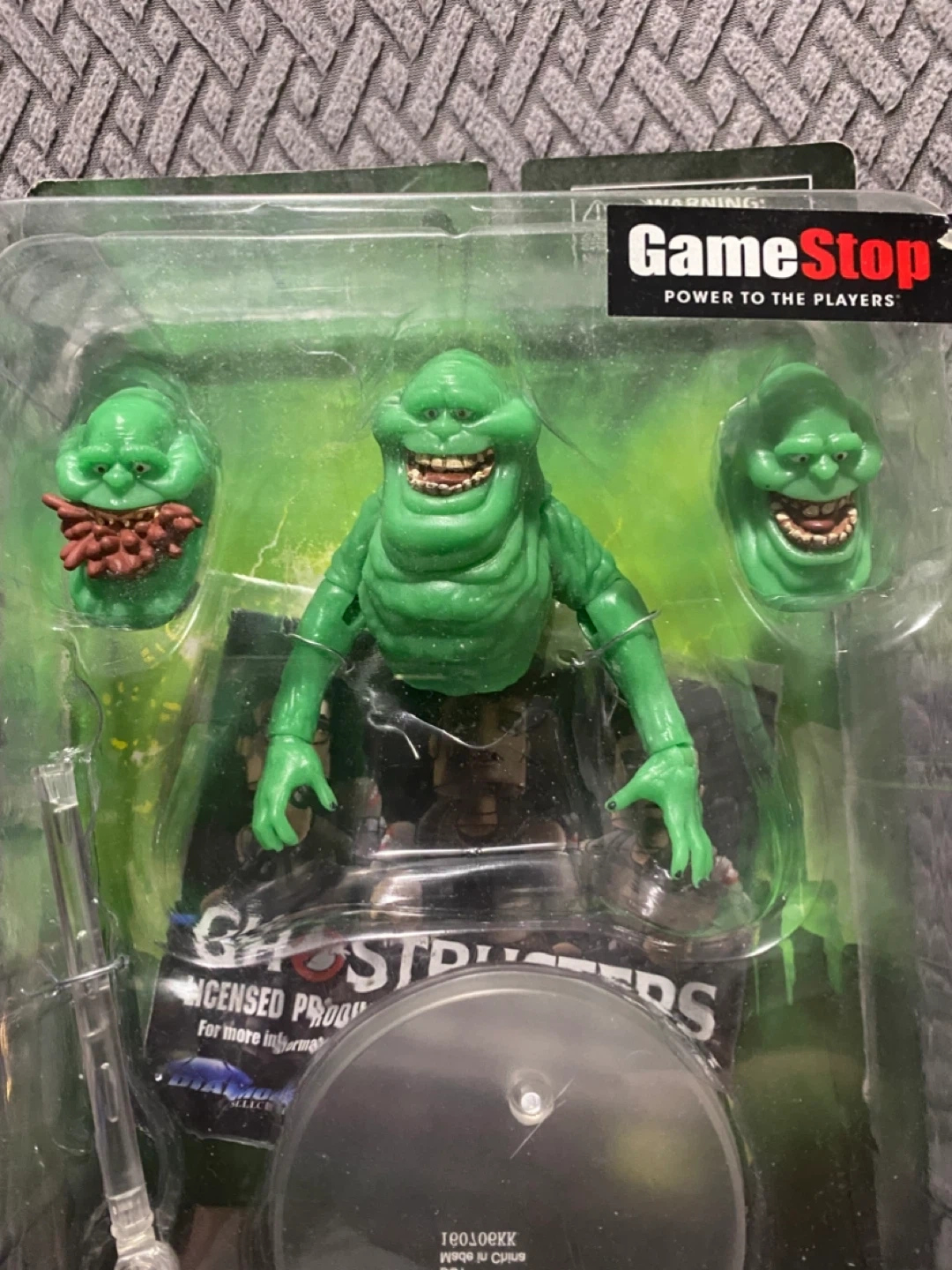 Selling a 2016 Ghostbusters Slimer Action Figure by Diamond Select Toys. This is a 7” scale Slimer ghost figure with 3 interchangeable faces. This box set has been opened and displayed once. The figure and 3 faces are in “like new” condition. The stand is broken. The peg from the stand got stuck in the hole of the platform. Might be able to replace or repair. Sold as is. See pictures.