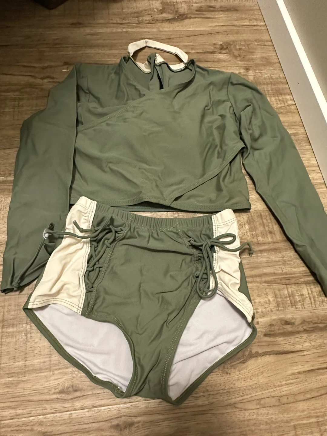 This is a long sleeve rash guard and high-waisted bikini set. It's a two-piece swimsuit. The set features a green rash guard with a cream trim and matching green bottoms with cream side panels and adjustable tie details.