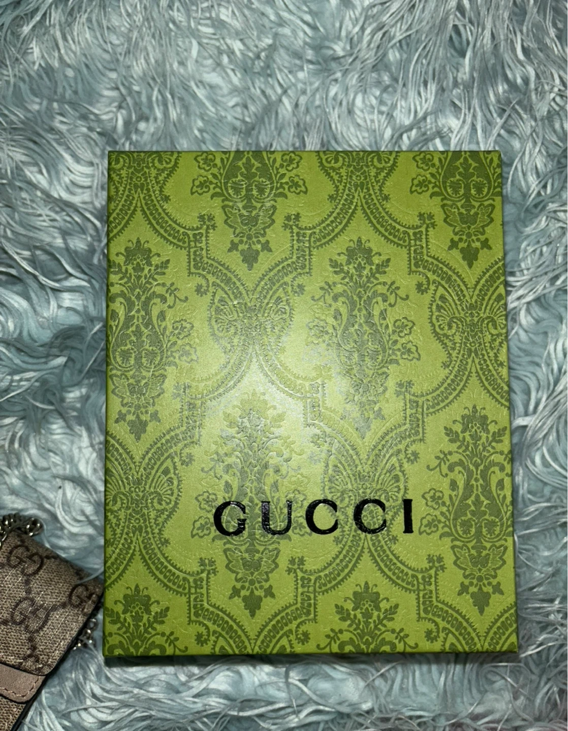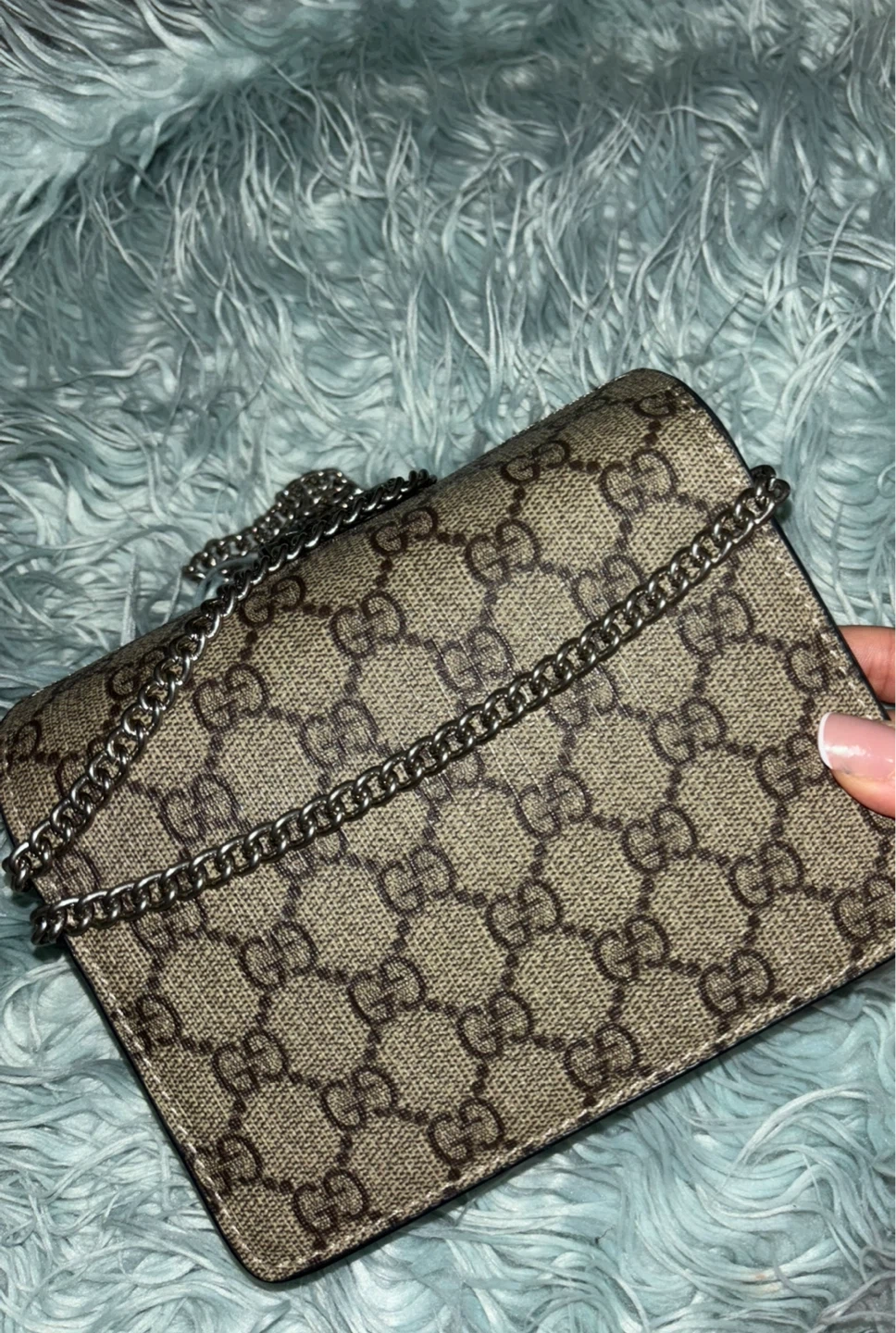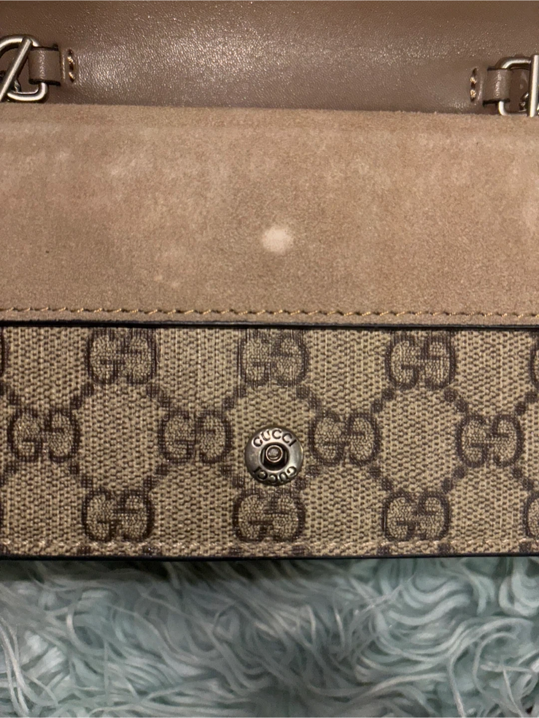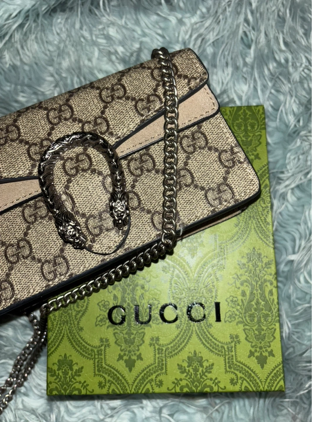 Selling a Gucci Dionysus chain wallet. It has the iconic Gucci monogram pattern and the Dionysus tiger head closure. It comes with the original box and care booklet. There appears to be a small mark on the suede.