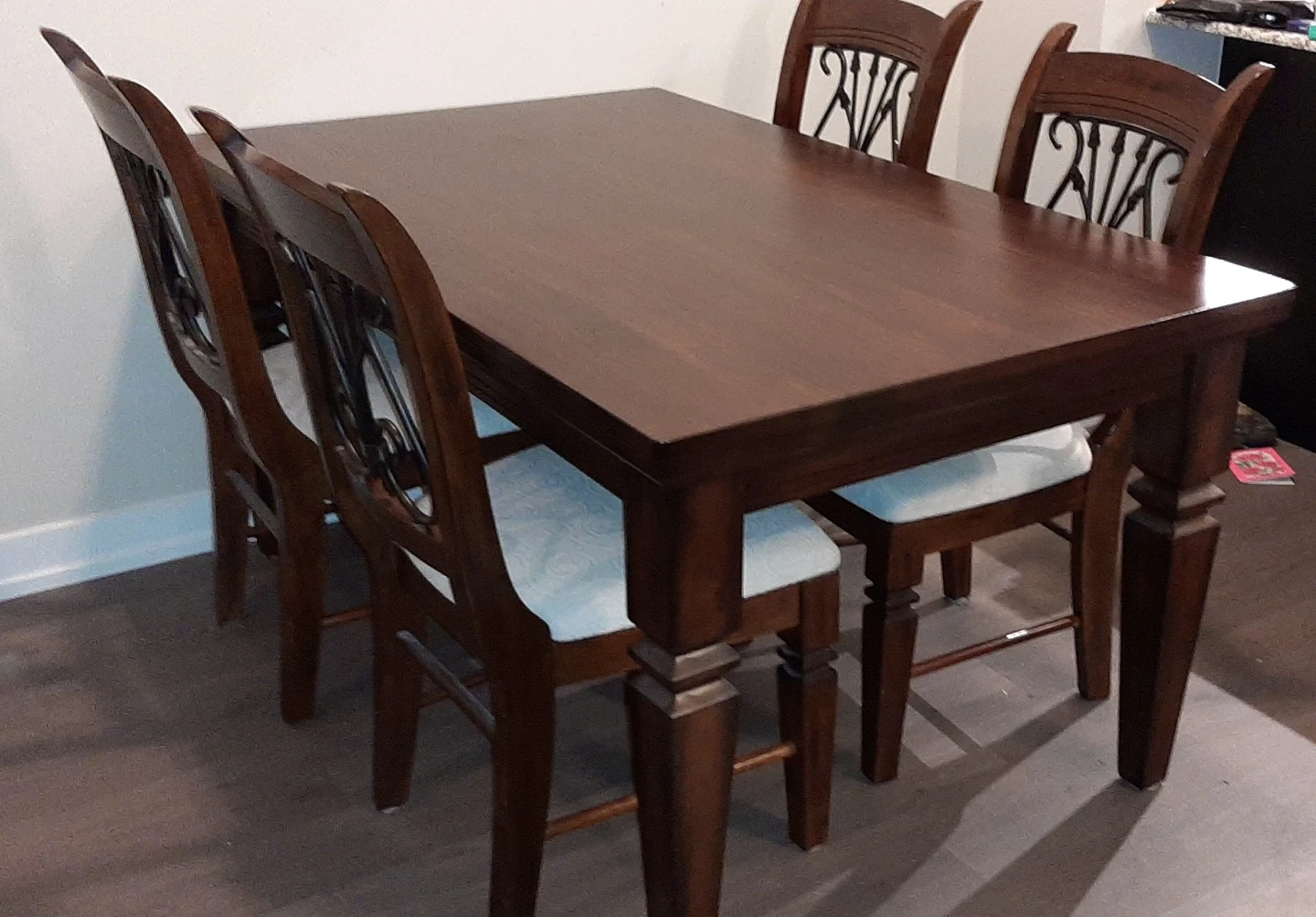 Dark wood dining set with a rectangular table and four upholstered chairs. The chairs feature decorative metal detailing on the backrests. This set is suitable for smaller dining spaces.