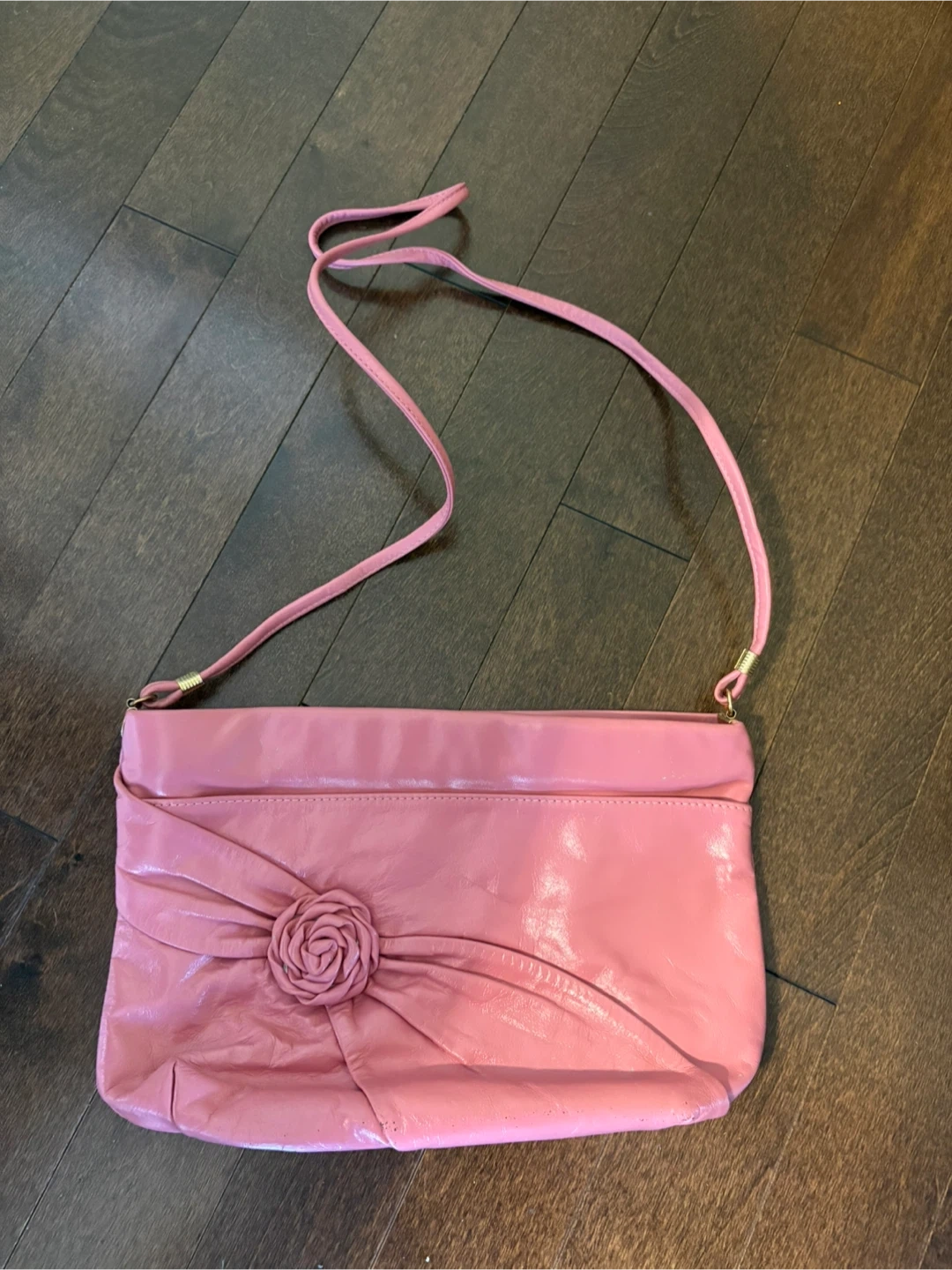 This is a sweet pink clutch or crossbody bag, made from genuine leather right here in Canada. It's got a nice floral detail on the front and a thin adjustable strap. The interior lining looks like a tan fabric.