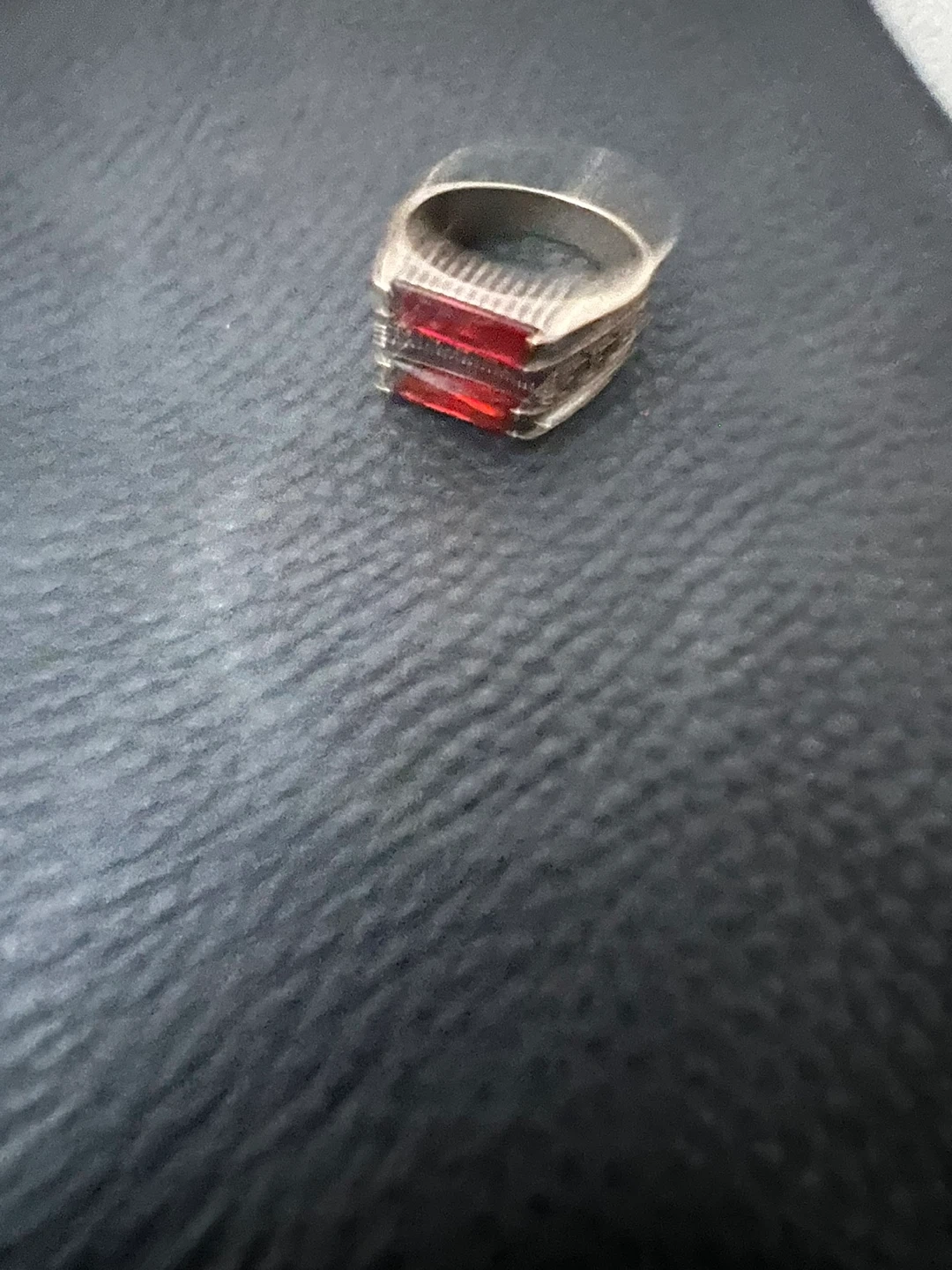 A men's ring with a silver-tone band. It features two rectangular red stones set horizontally. The band has a ribbed detail on the sides.