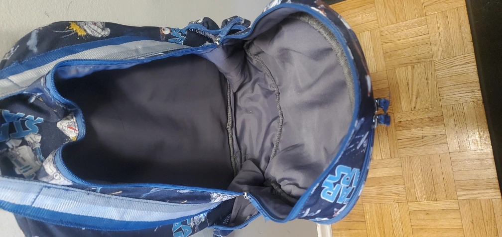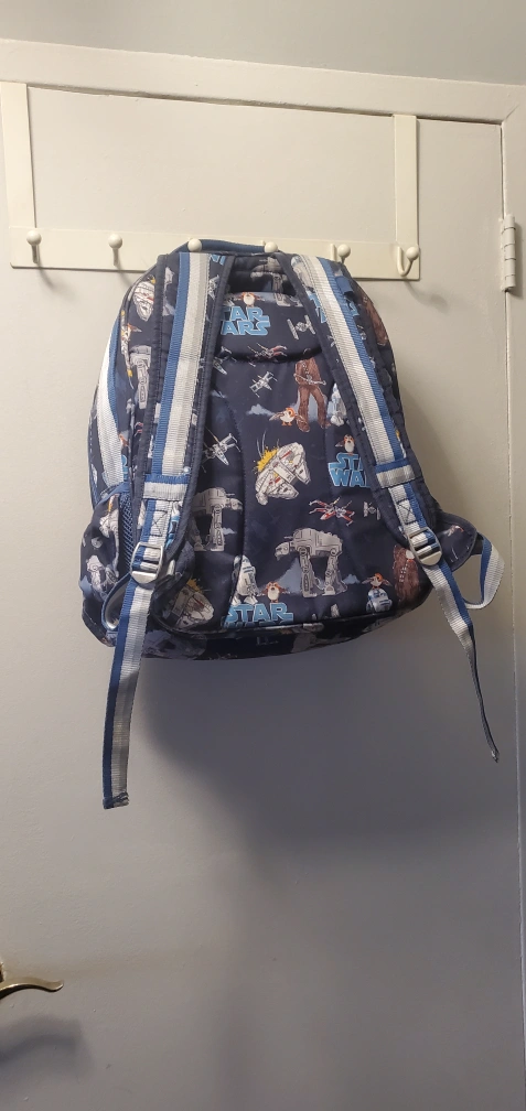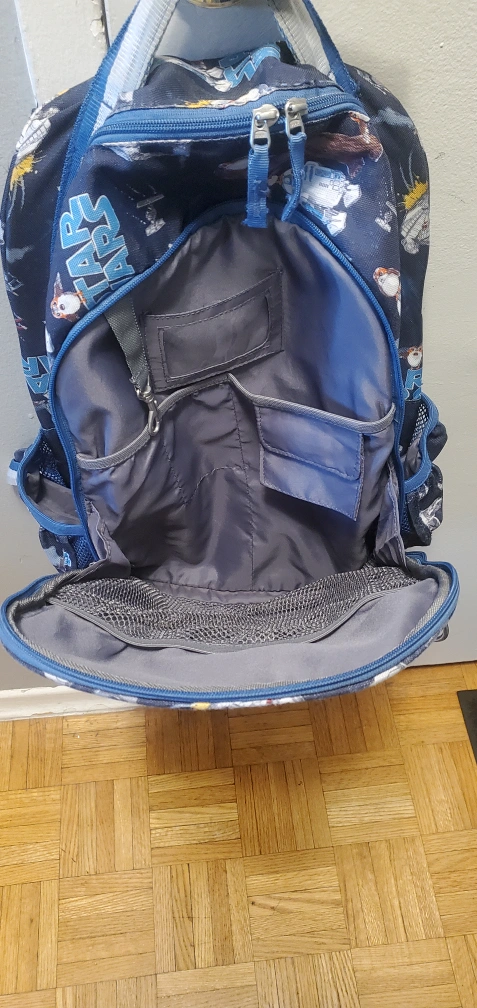 Blue Star Wars backpack. Features various Star Wars characters and vehicles. Multiple compartments and pockets. Great for school or everyday use.