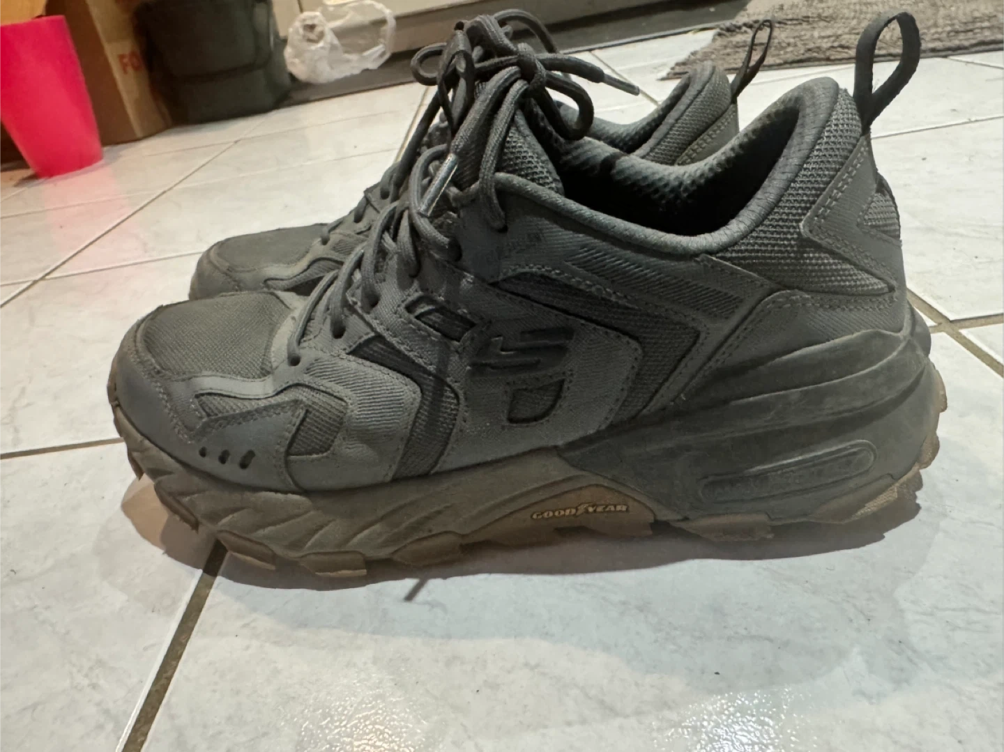 Selling a pair of Goodyear Skechers sneakers in gray. They have a rugged sole. And water repellent
