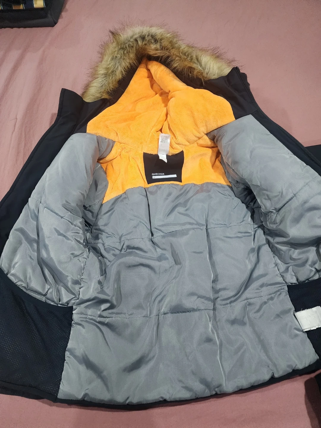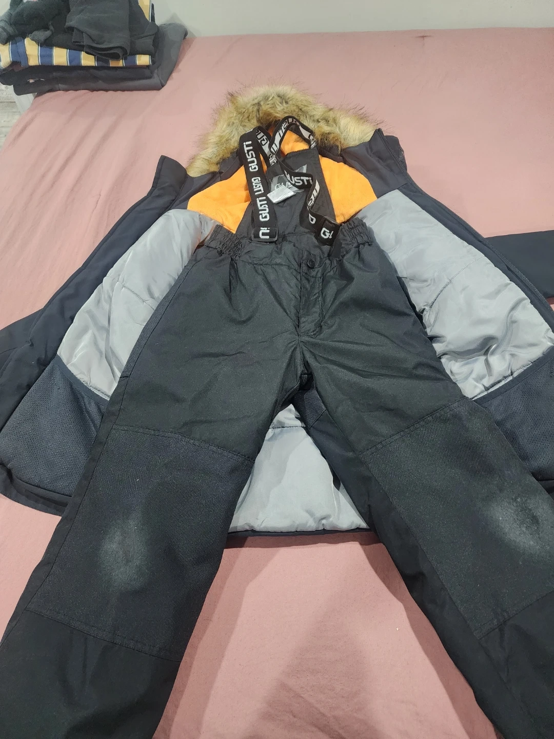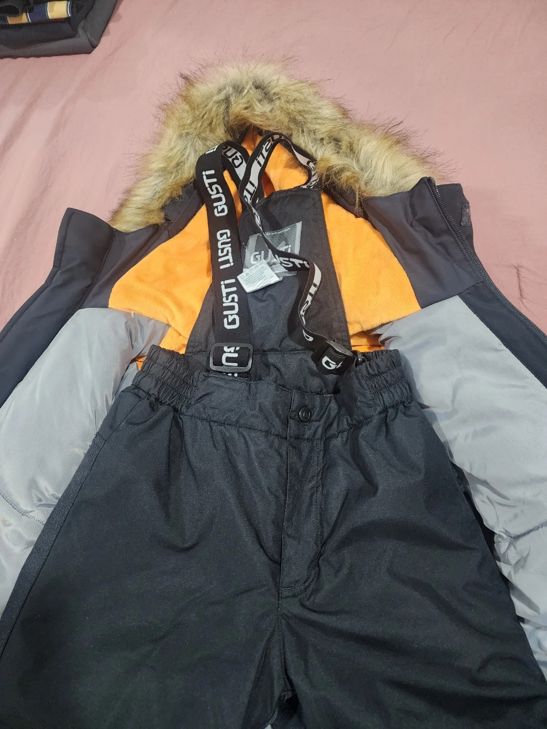 A Quechua jacket and Gusti snow pants set for winter adventures. The jacket features a faux-fur trimmed hood and insulated lining. Pants have adjustable suspenders for a snug fit. Perfect for keeping warm on the slopes!