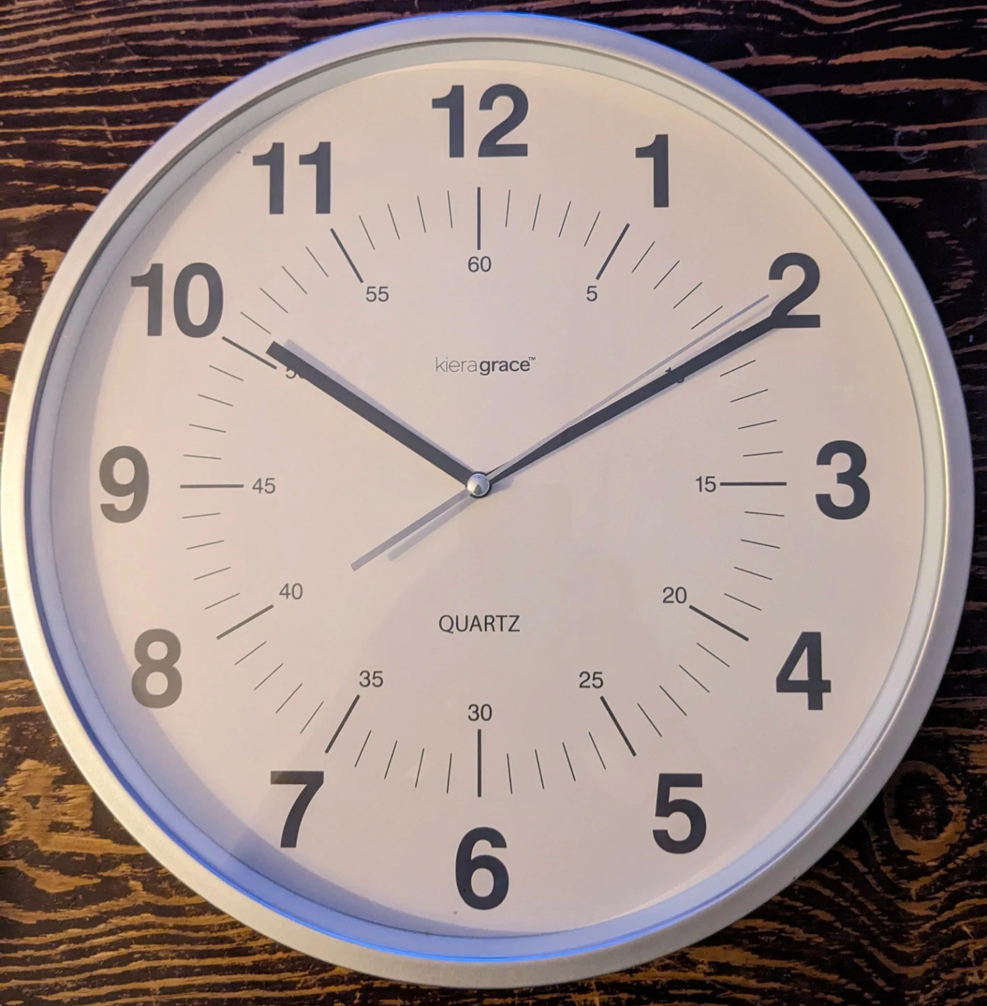 Selling a Kiera Grace 12" Wall Clock in deep silver. It's a synchro silent (non-ticking) clock, so no annoying ticking sounds! Perfect for any room in the house