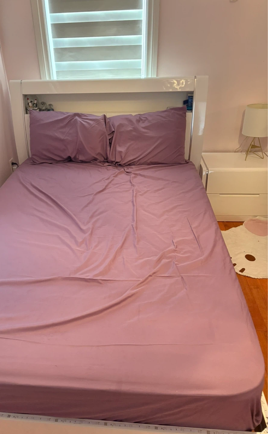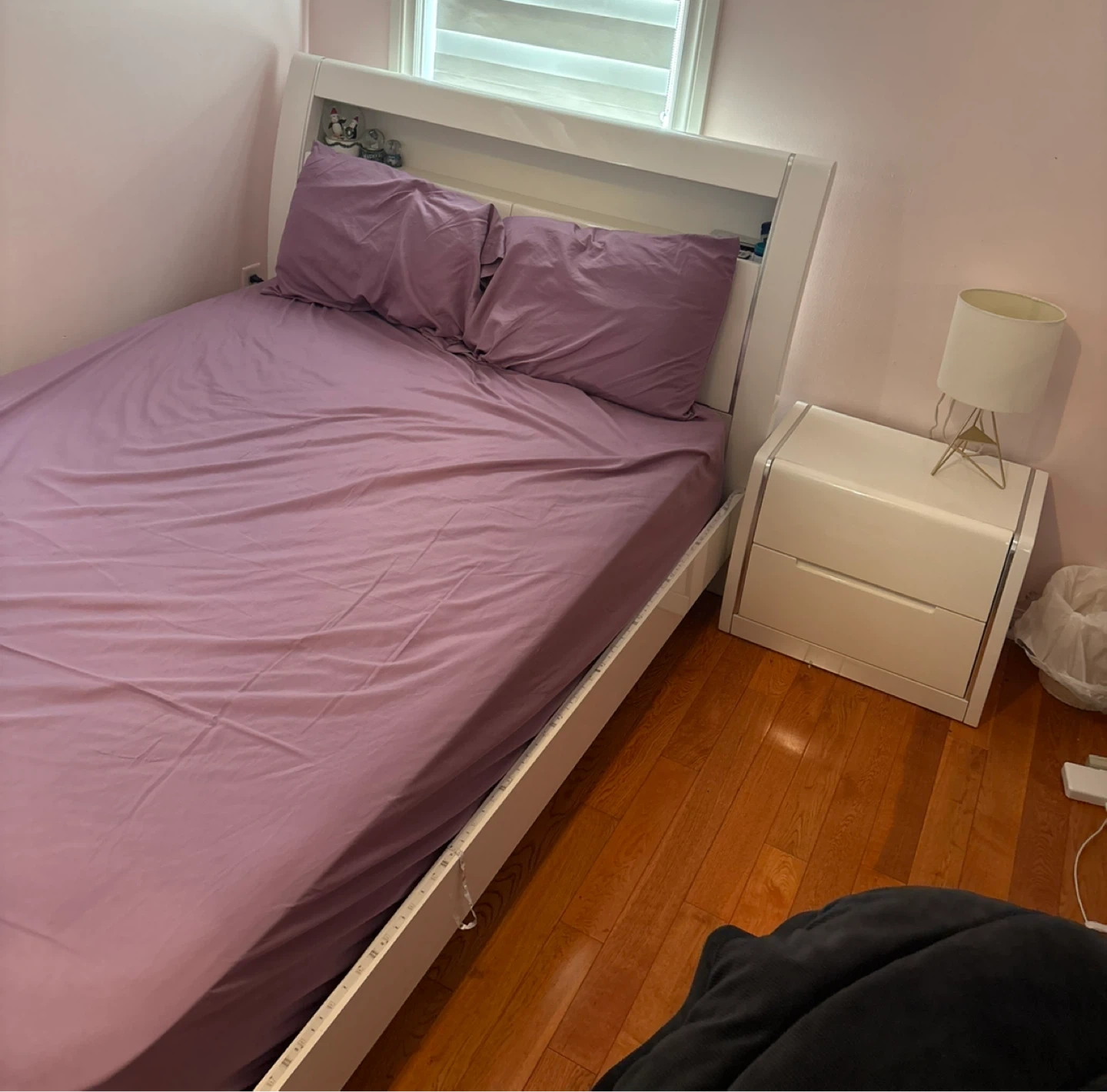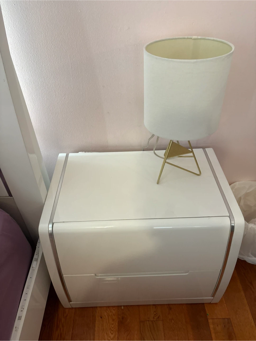 A sleek white platform bed frame featuring a convenient headboard with built-in storage. Perfect for keeping your bedroom tidy and organized! This bed doesn't require a box spring, making setup a breeze. As well as 2 matching nightstands as well as 2 matching night lamps. The mattress is not included with all of this. It is a size double bed