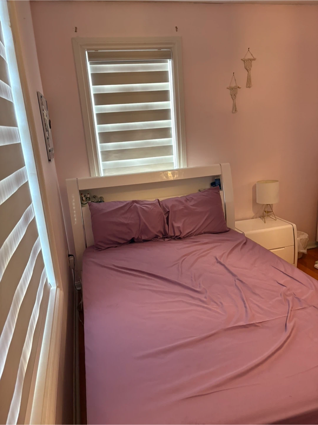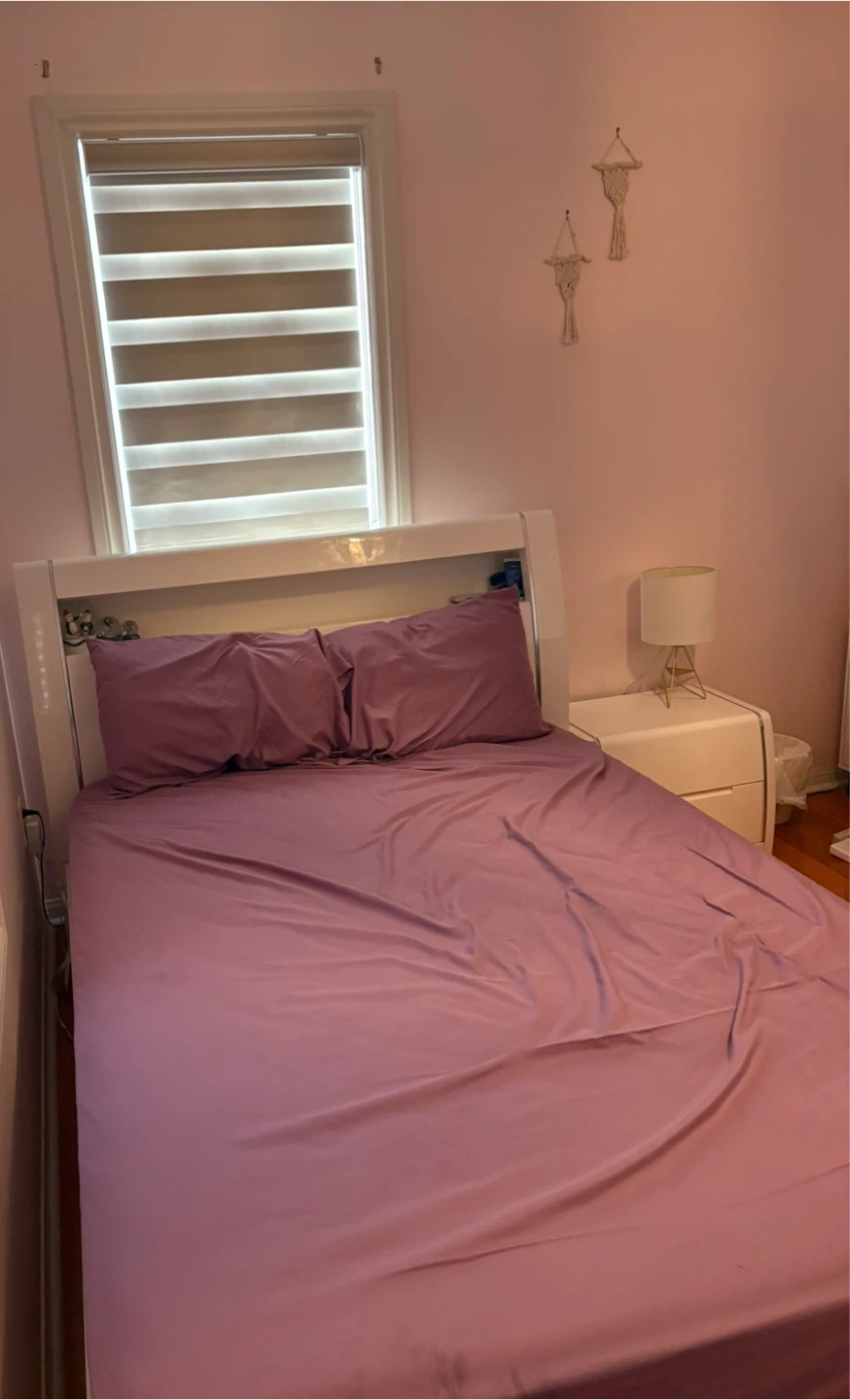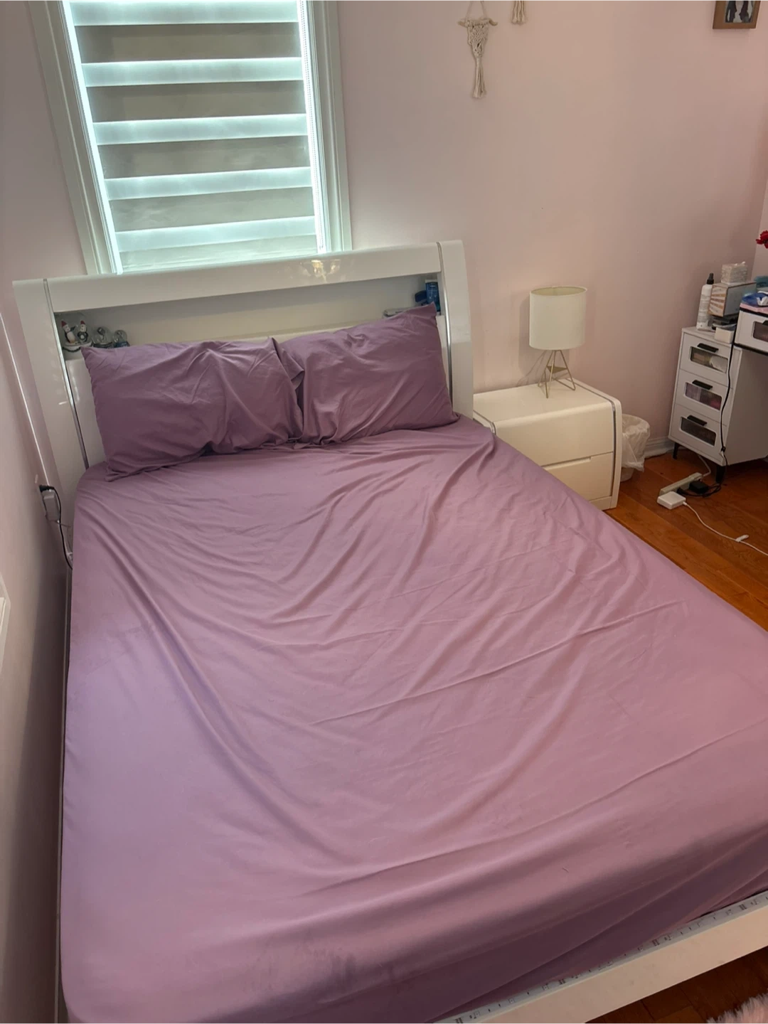 A sleek white platform bed frame featuring a convenient headboard with built-in storage. Perfect for keeping your bedroom tidy and organized! This bed doesn't require a box spring, making setup a breeze. As well as 2 matching nightstands as well as 2 matching night lamps. The mattress is not included with all of this. It is a size double bed