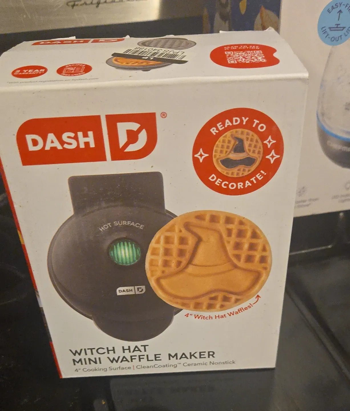 This Dash mini waffle maker creates 4" witch hat shaped waffles. It features a 4" cooking surface with a ceramic nonstick coating. Ready to decorate!